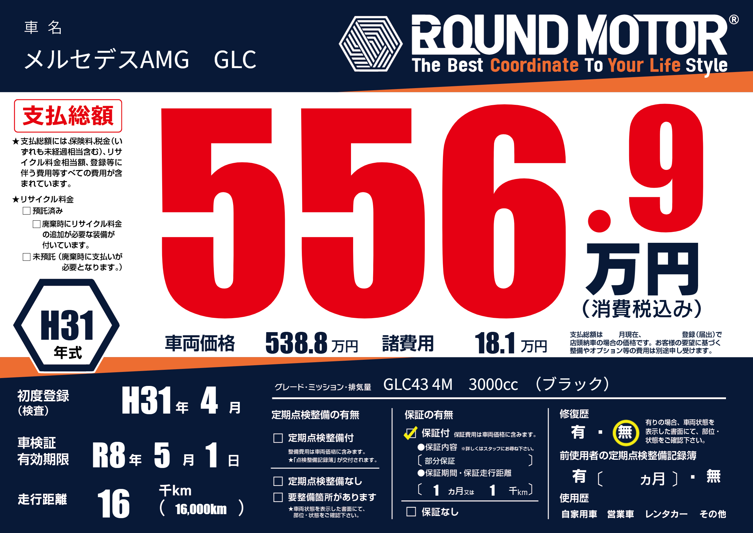 | 車名 | メルセデスAMG GLC | グレード ミッション 排気量 |
