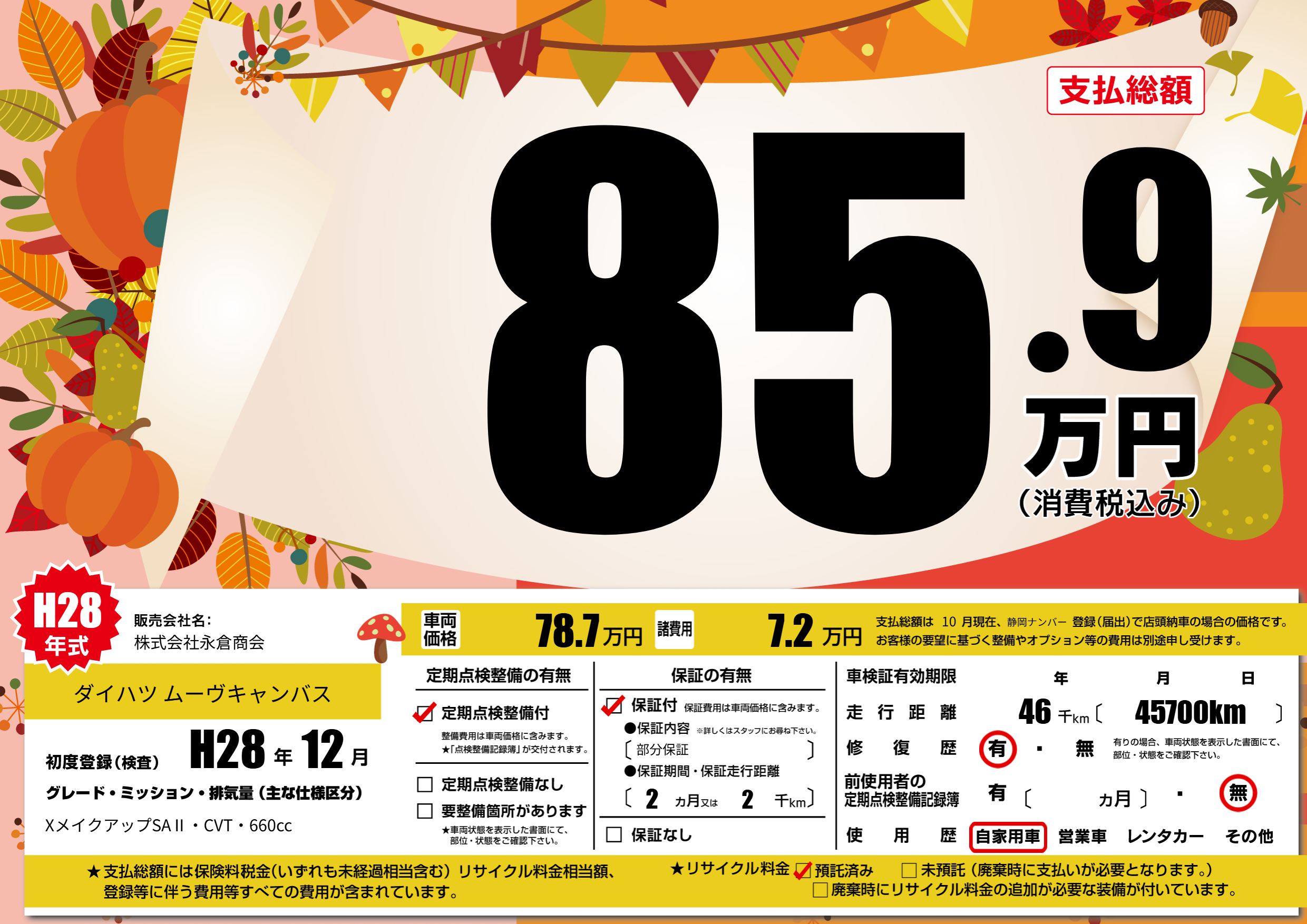 | 走行キロ | 4.6万km | 初年度登録 | H28年12月 |