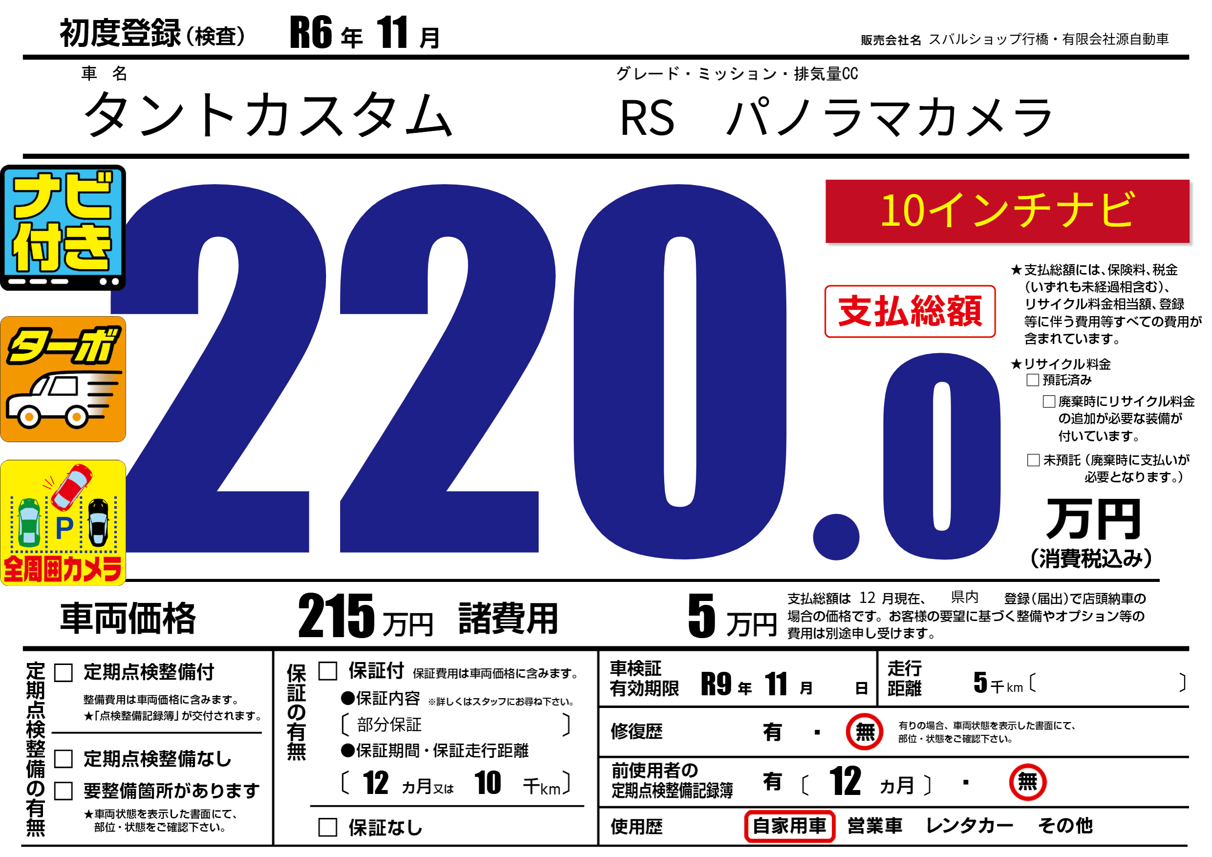 | 車名 | タントカスタム | グレード ミッション 排気量 |