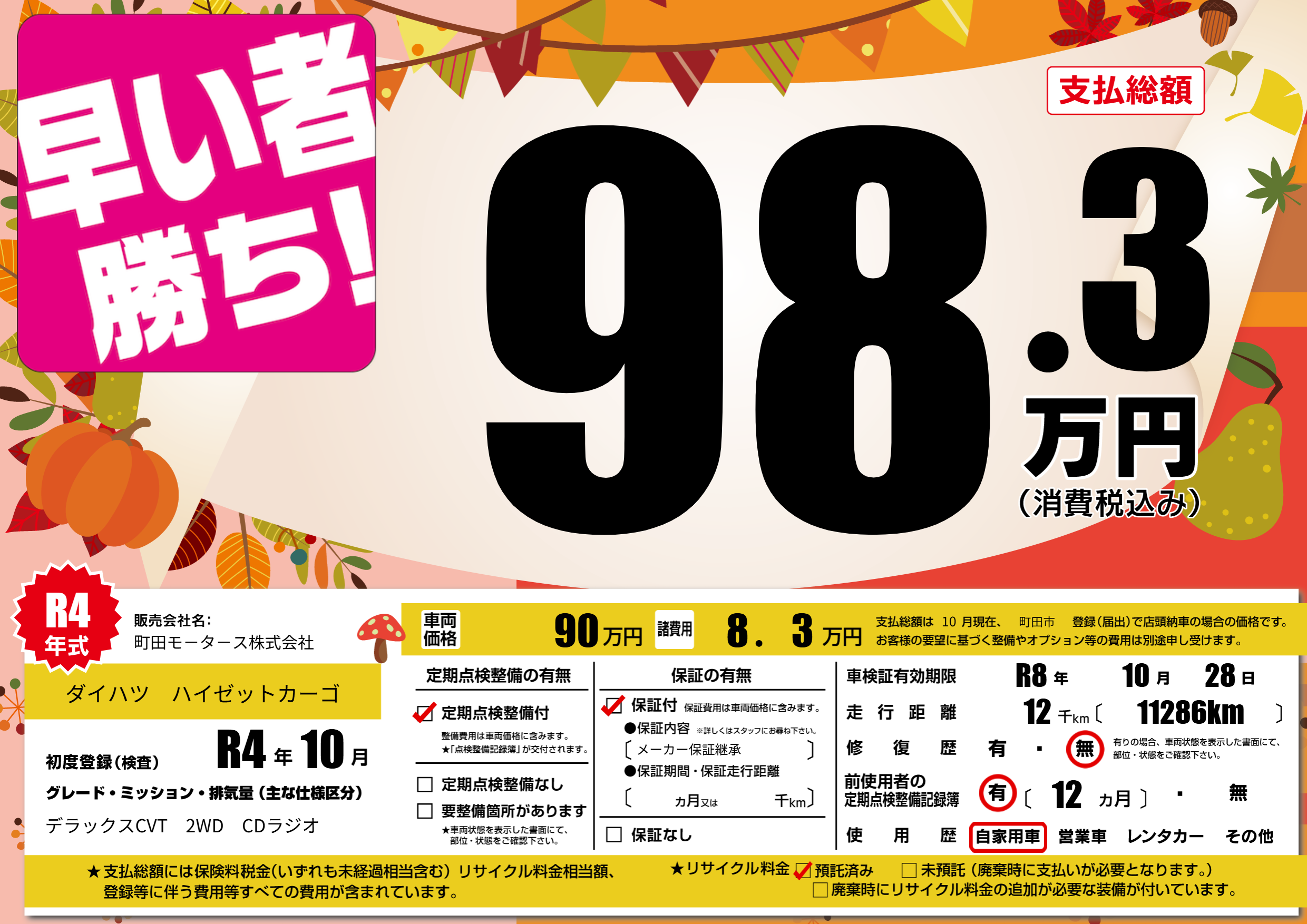 | 走行キロ | 1.2万km | 初年度登録 | R4年10月 |