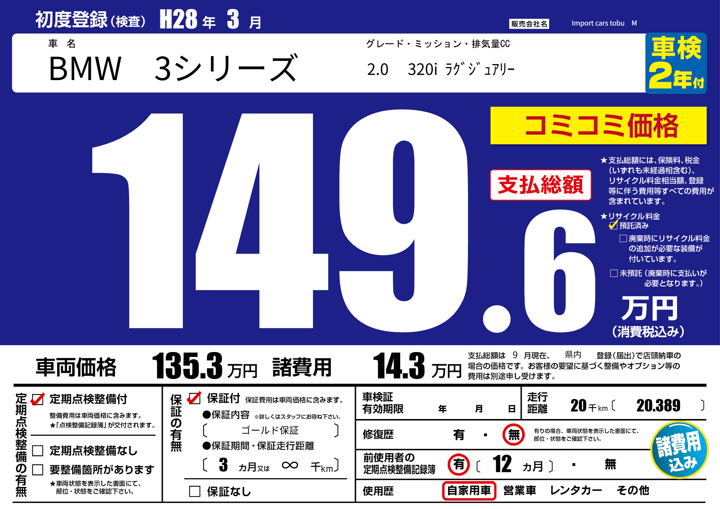 | 車名 | BMW 3シリーズ | グレード ミッション 排気量 |