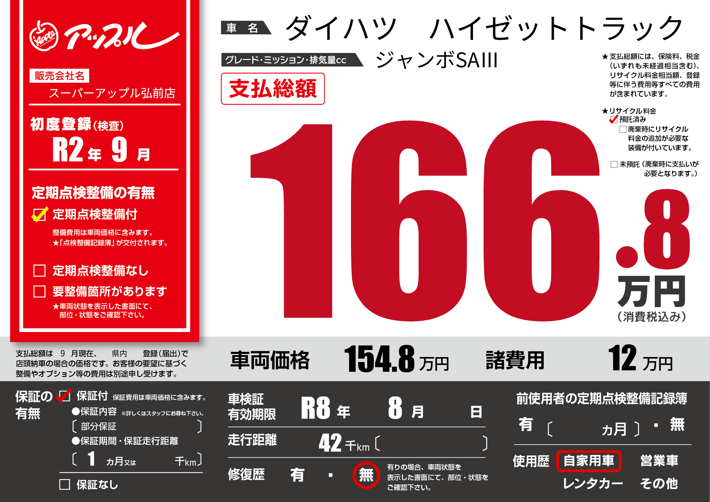 | 走行キロ | 4.2万km | 初年度登録 | R2年9月 |