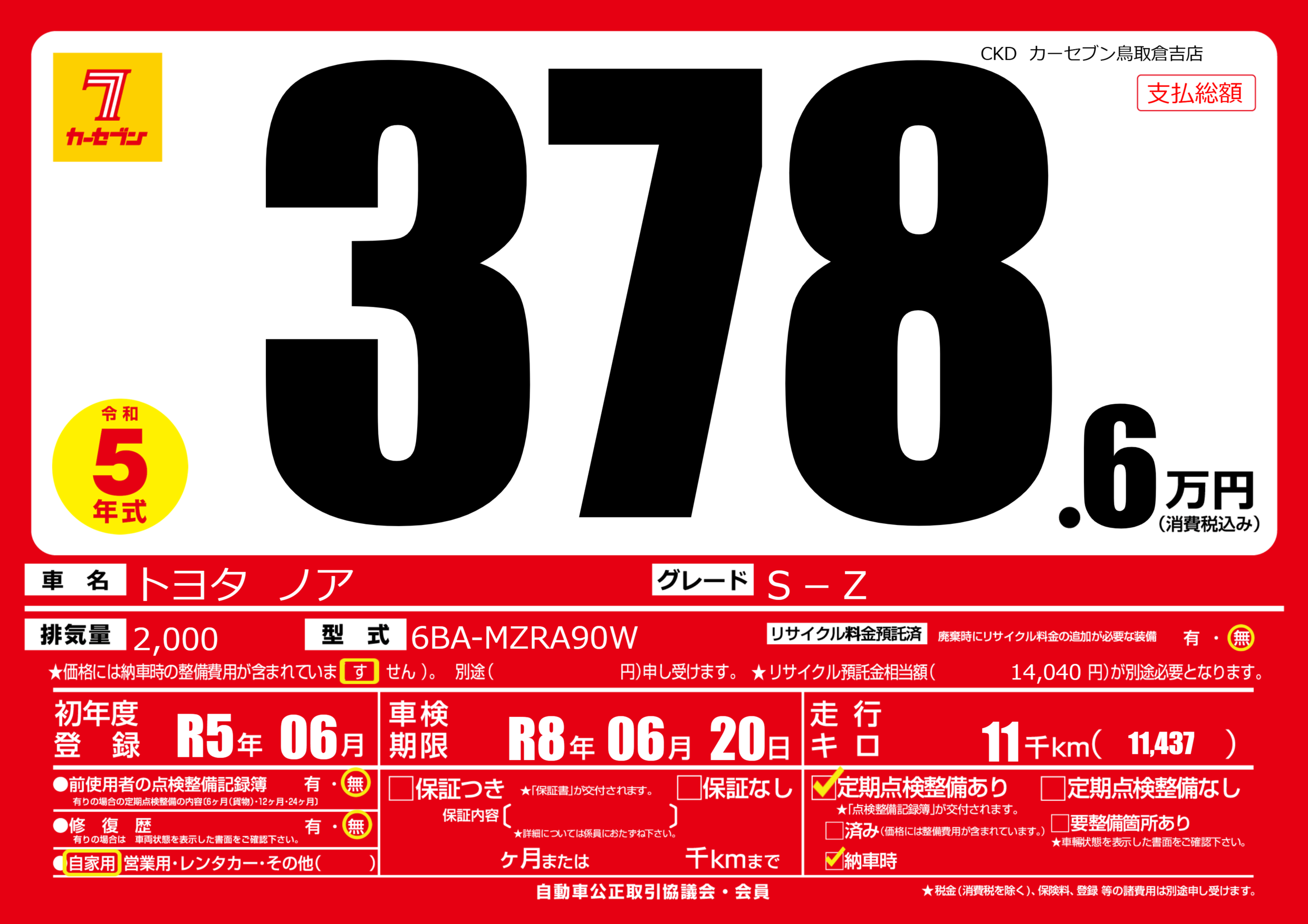 | 走行キロ | 1.1万km | 初年度登録 | R5年06月 |