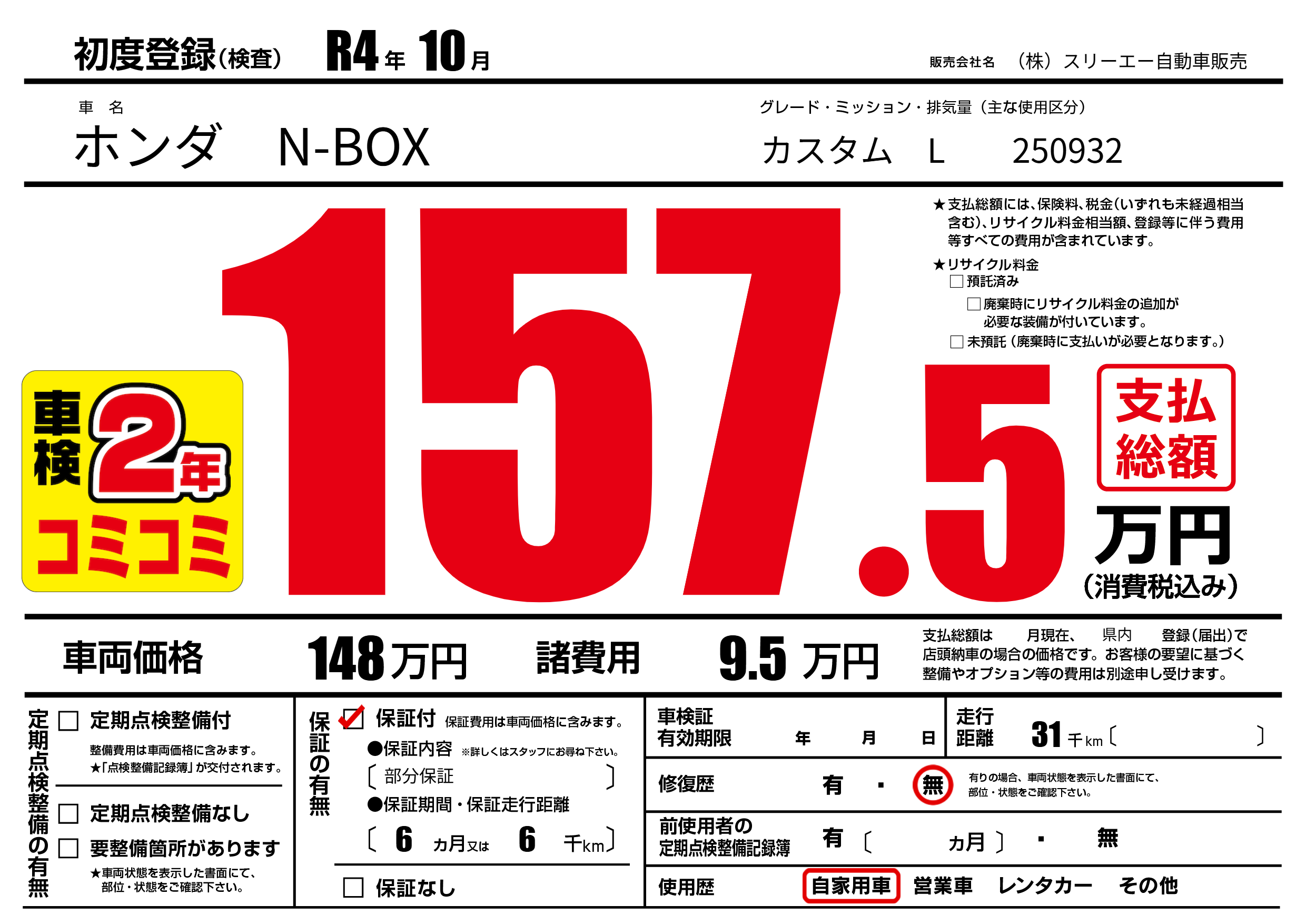 保証付き 保証内容(部分保証) 6ヶ月または(6)千kmまで |