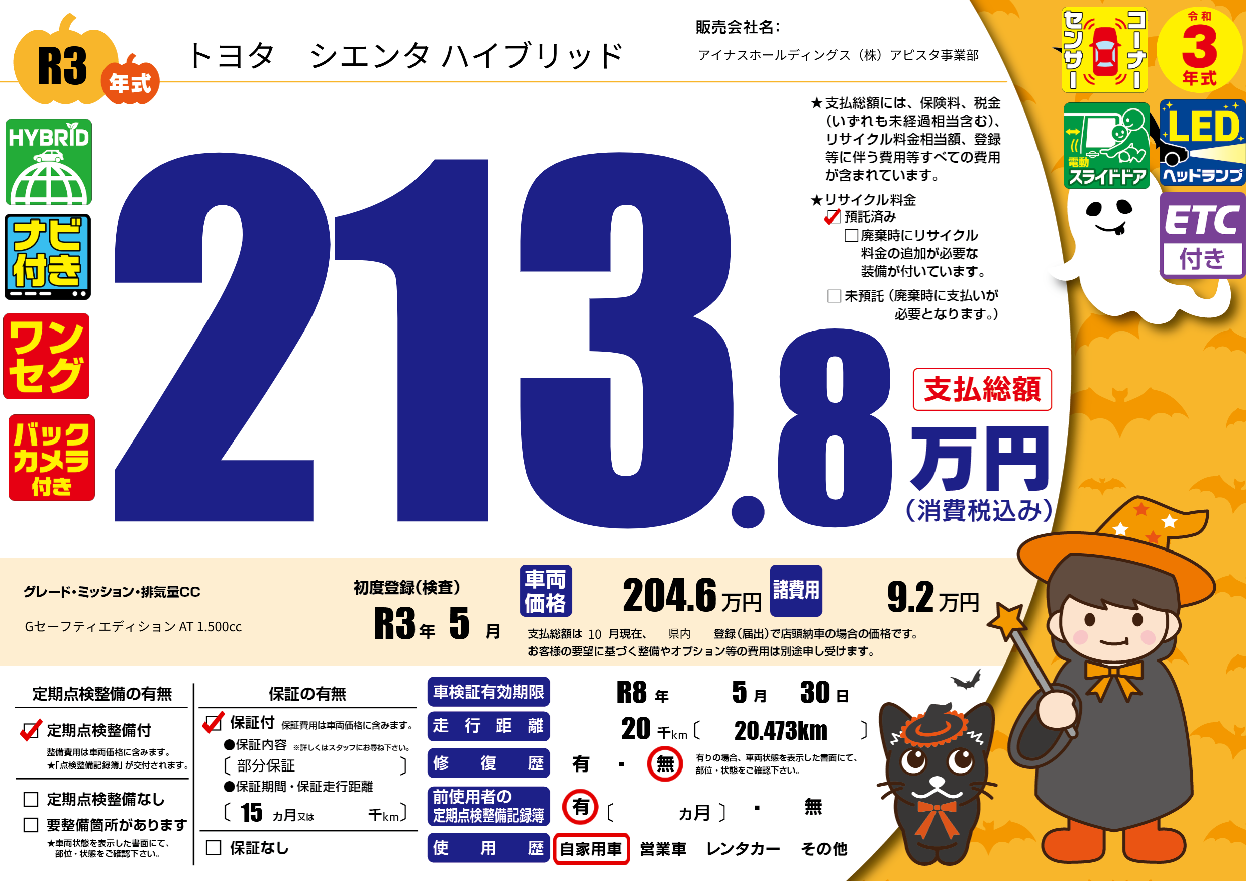 | 車名 | トヨタ シエンタ ハイブリッド | グレード ミッション 排気量 |