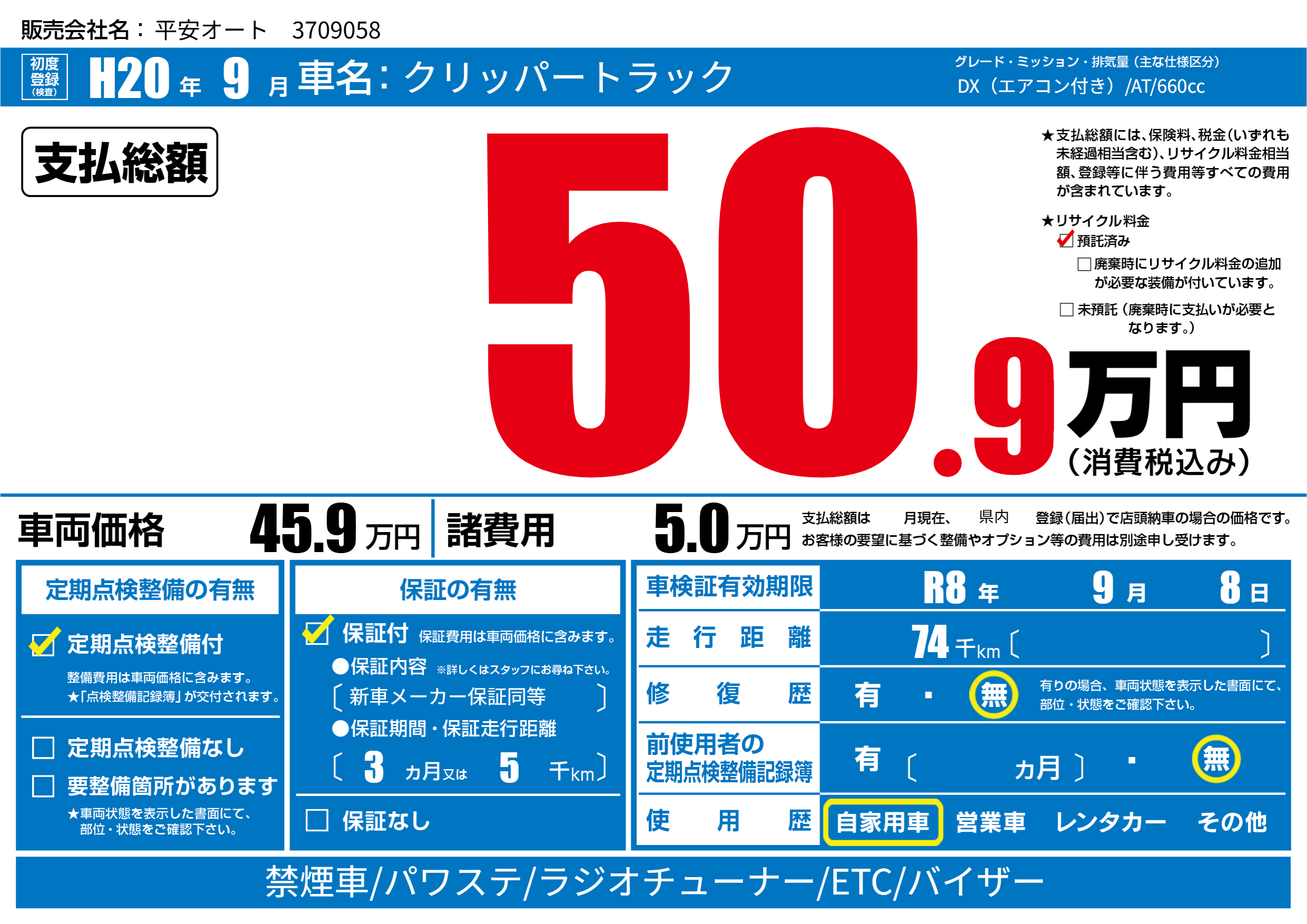 | 走行キロ | 7.4万km | 初年度登録 | H20年9月 |