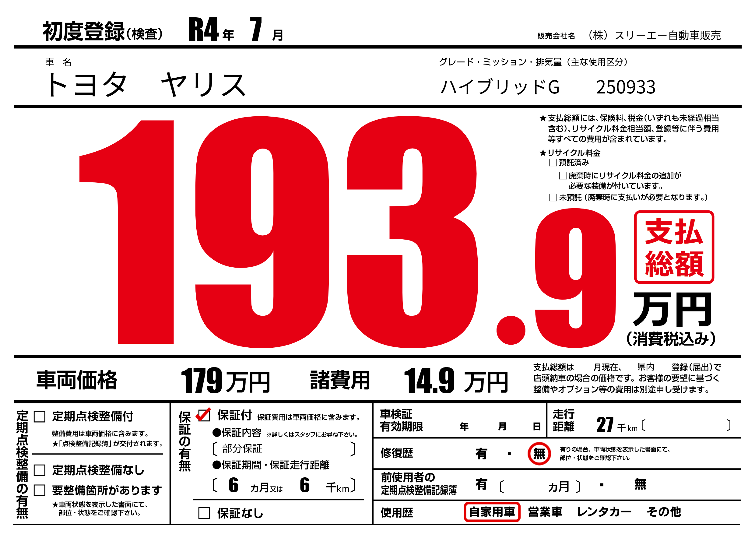 | 車名 | トヨタ ヤリス | グレード ミッション 排気量 |