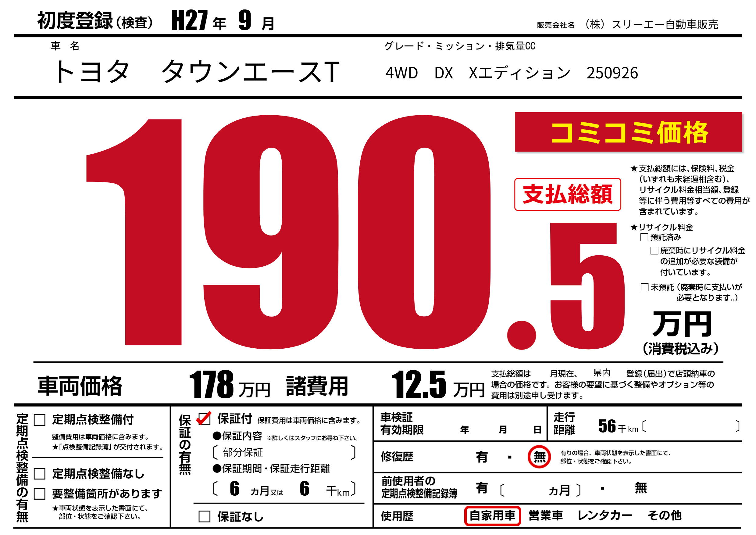 | 車名 | トヨタ タウンエースT | グレード ミッション 排気量 |