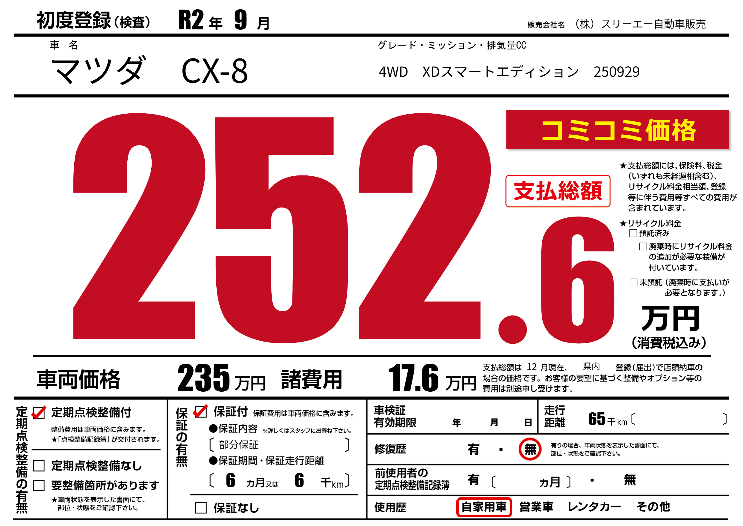 保証付き 保証内容(部分保証) 6ヶ月または(6)千kmまで |