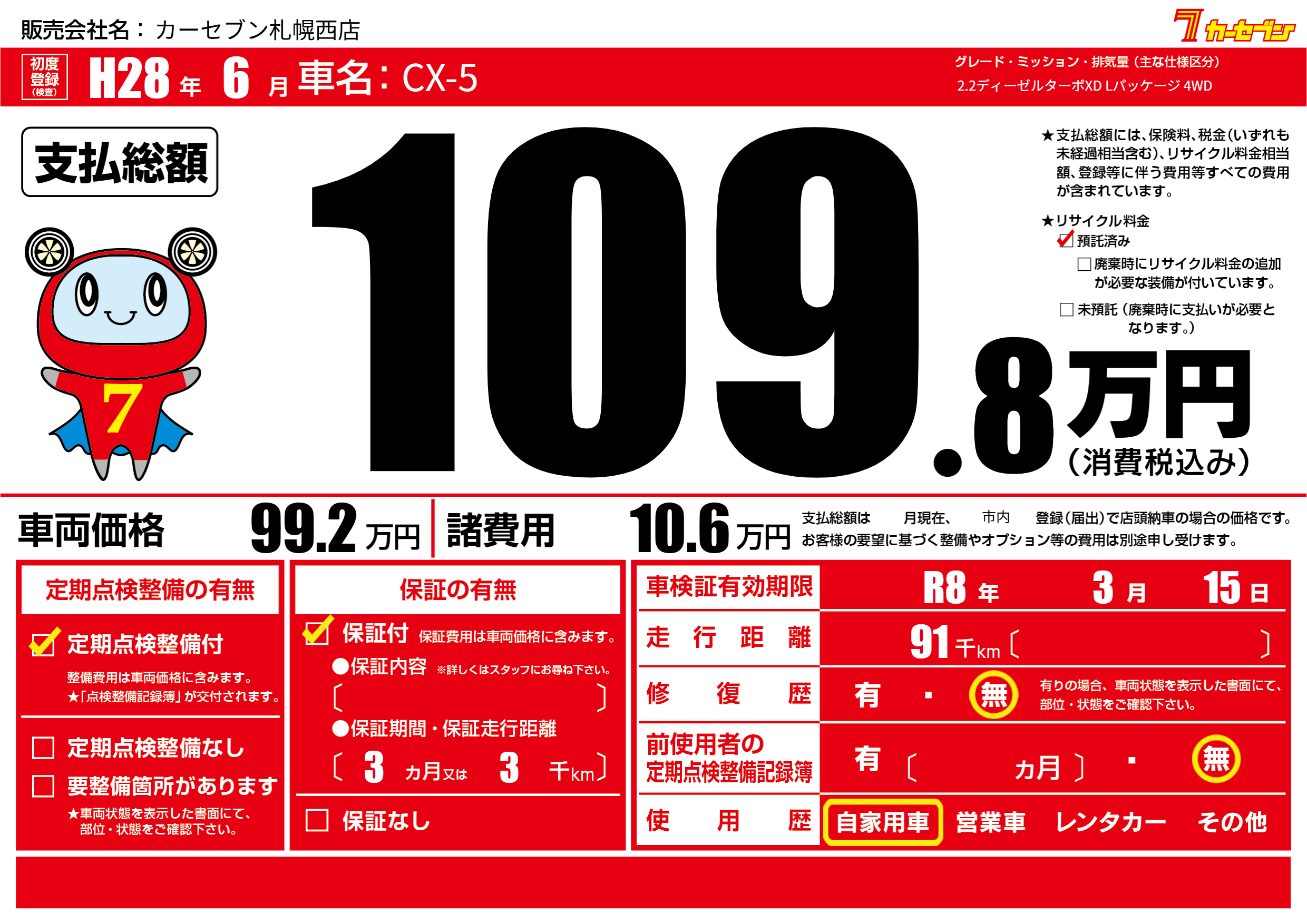 | 走行キロ | 9.1万km | 初年度登録 | H28年6月 |