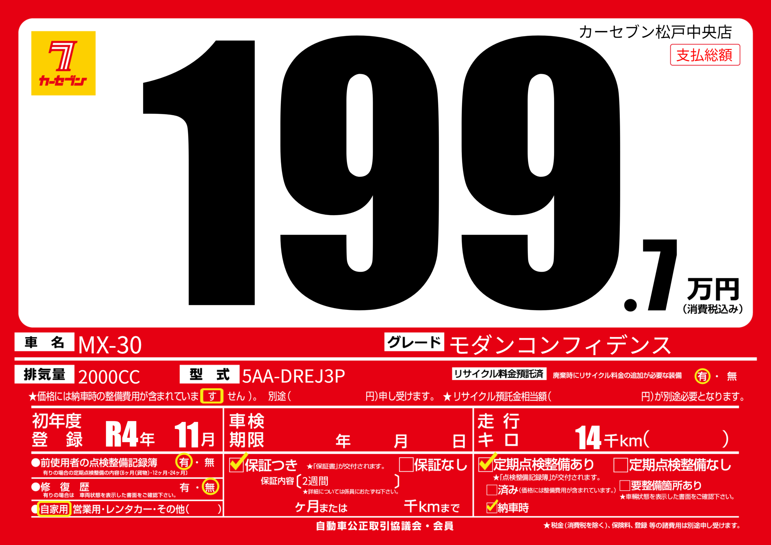 | 車名 | MX-30 | グレード ミッション 排気量 |