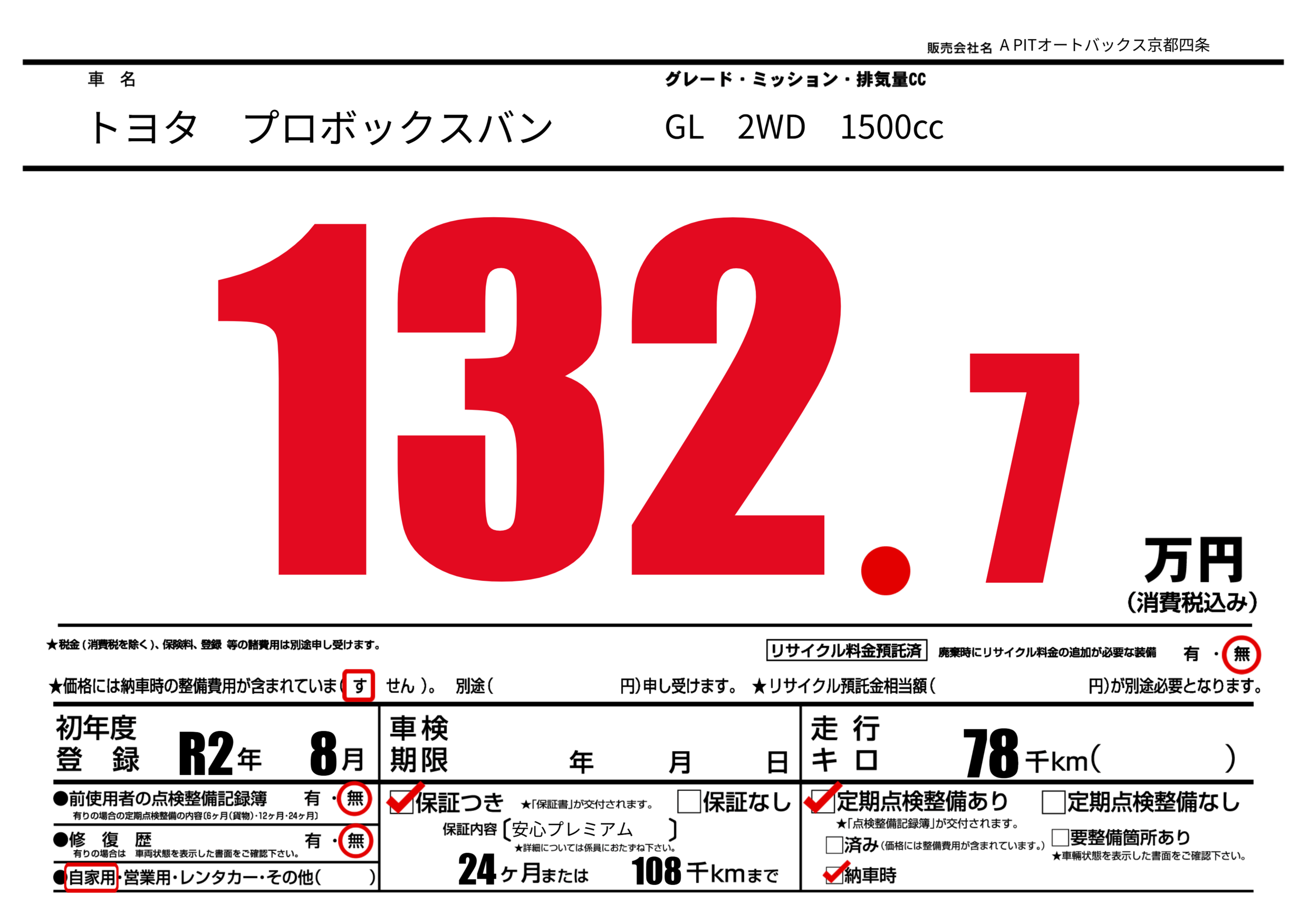 保証なし 保証内容(安心プレミアム) 24ヶ月または(108)千kmまで |