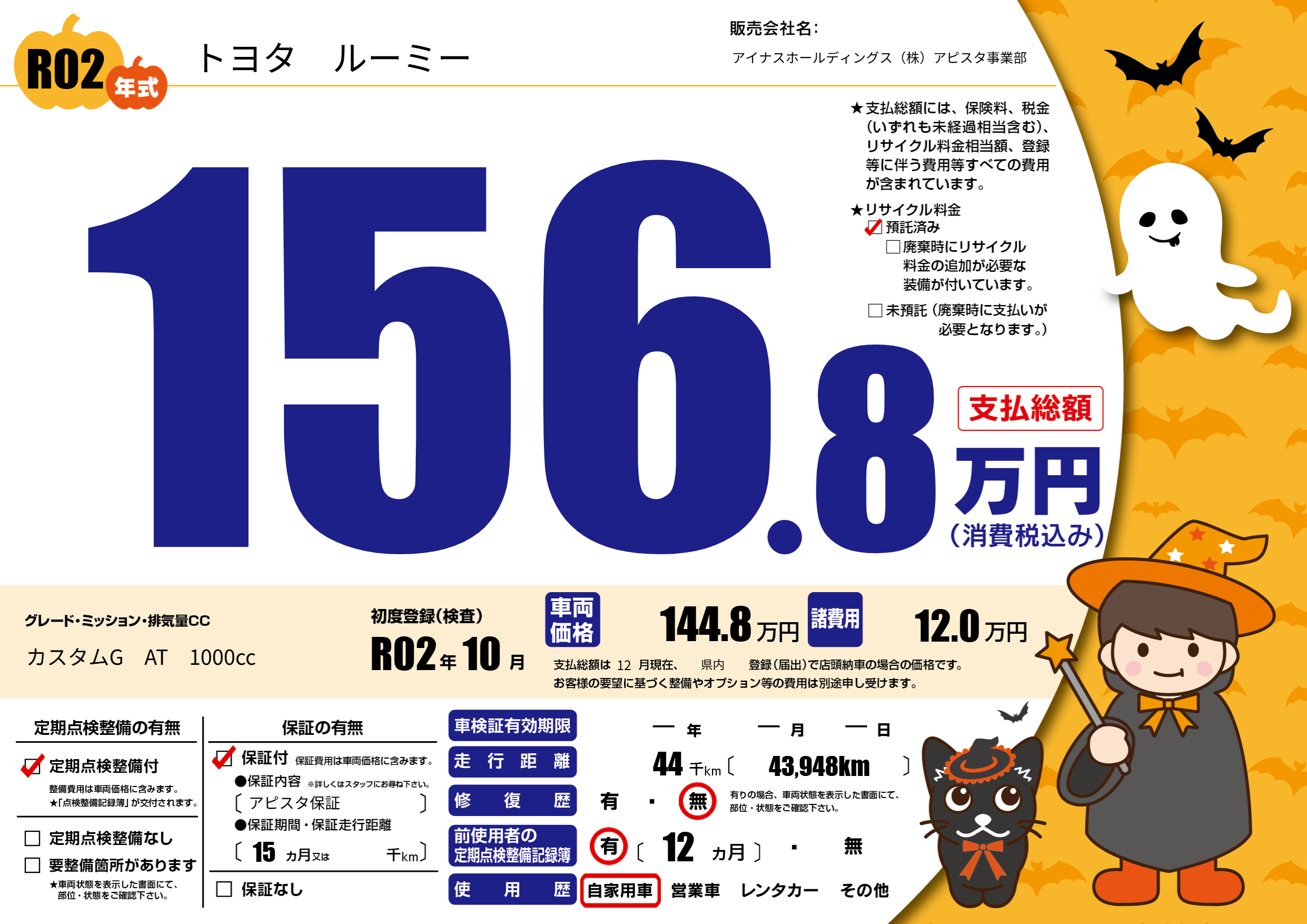 | 走行キロ | 4.4万km | 初年度登録 | R02年10月 |