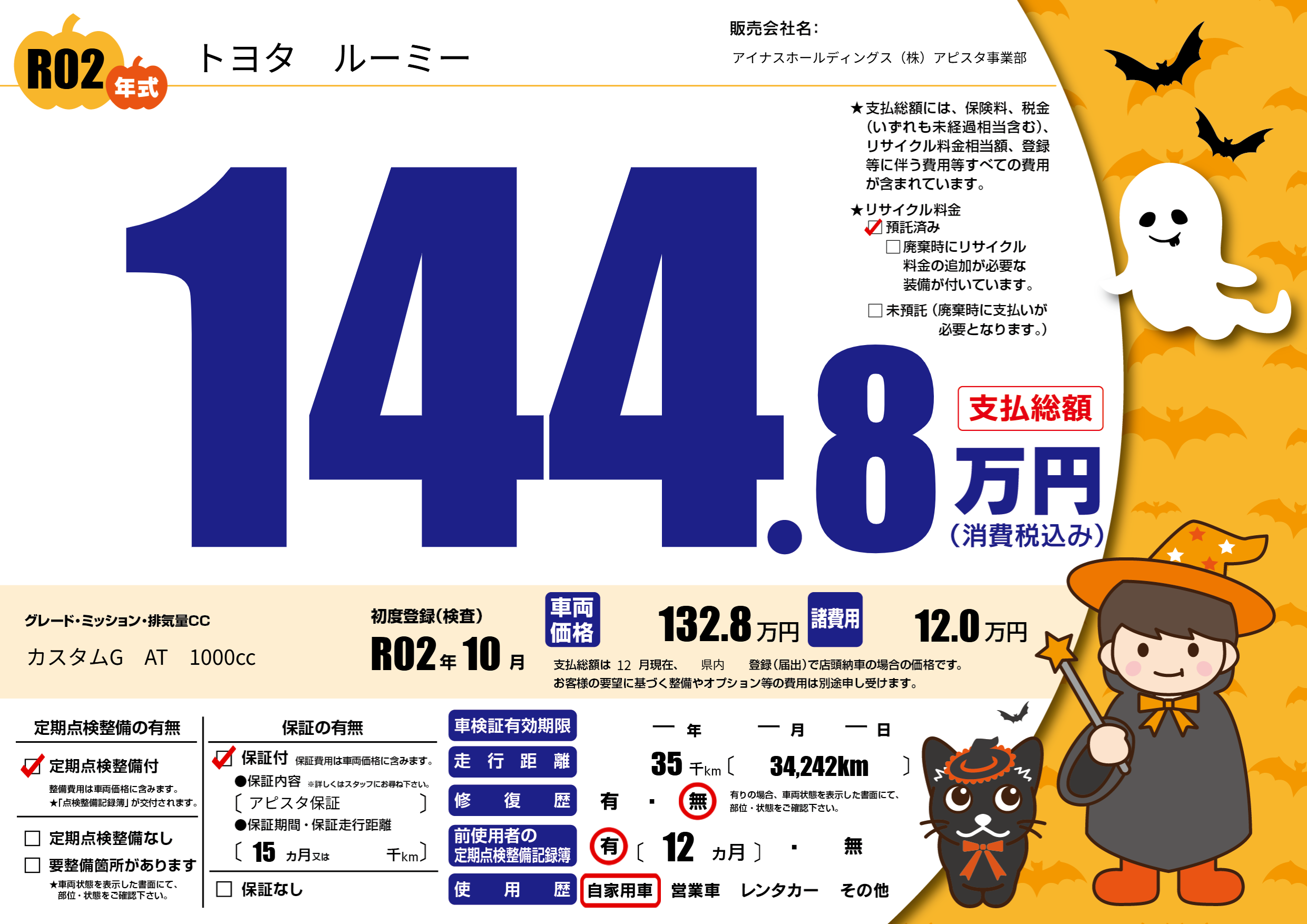 | 走行キロ | 3.5万km | 初年度登録 | R02年10月 |