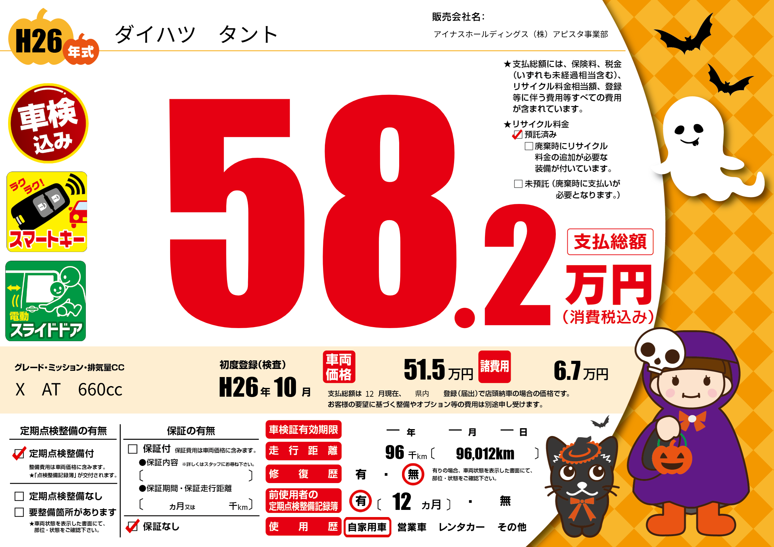 | 走行キロ | 9.6万km | 初年度登録 | H26年10月 |