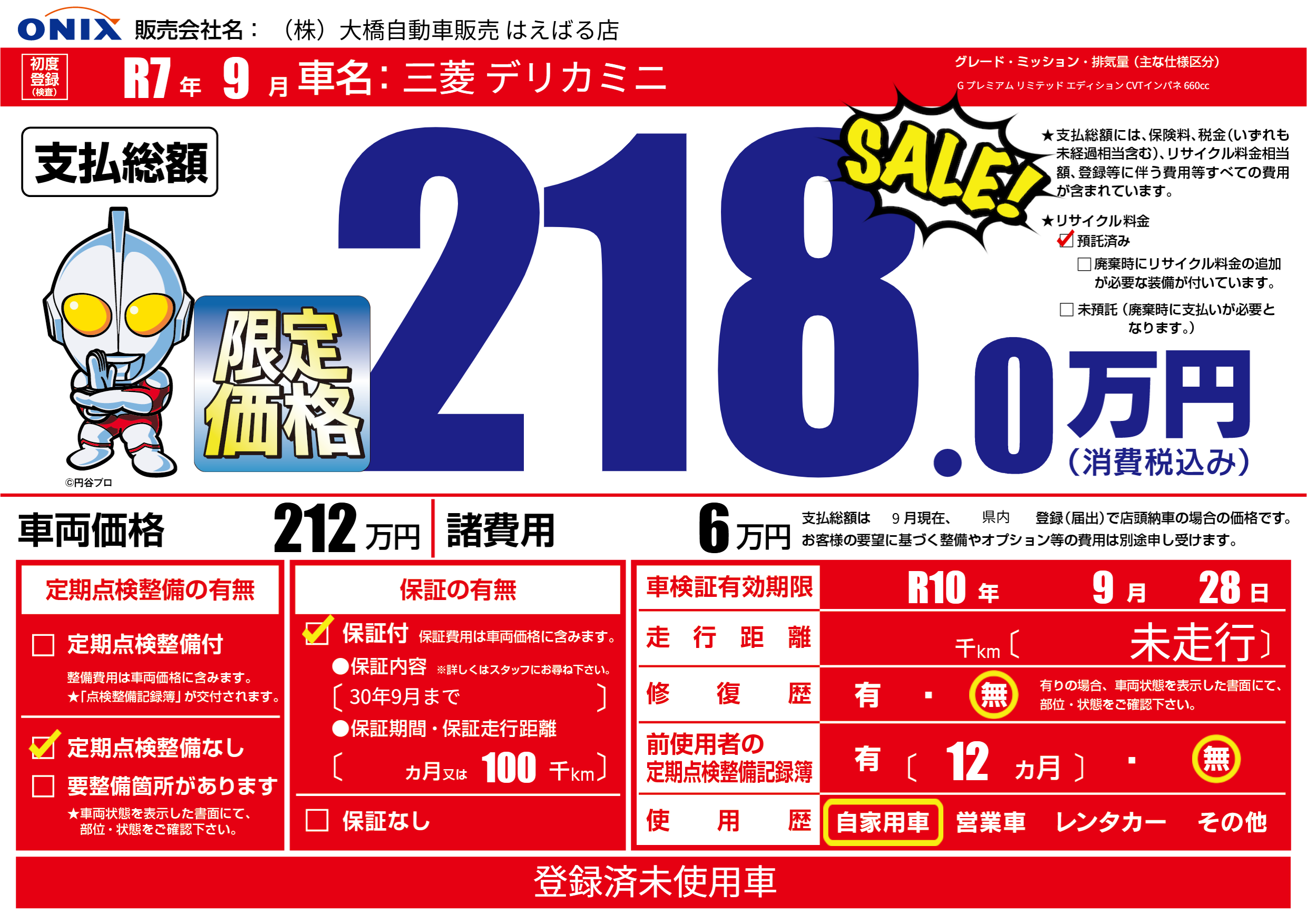 | 走行キロ | - | 初年度登録 | R7年9月 |