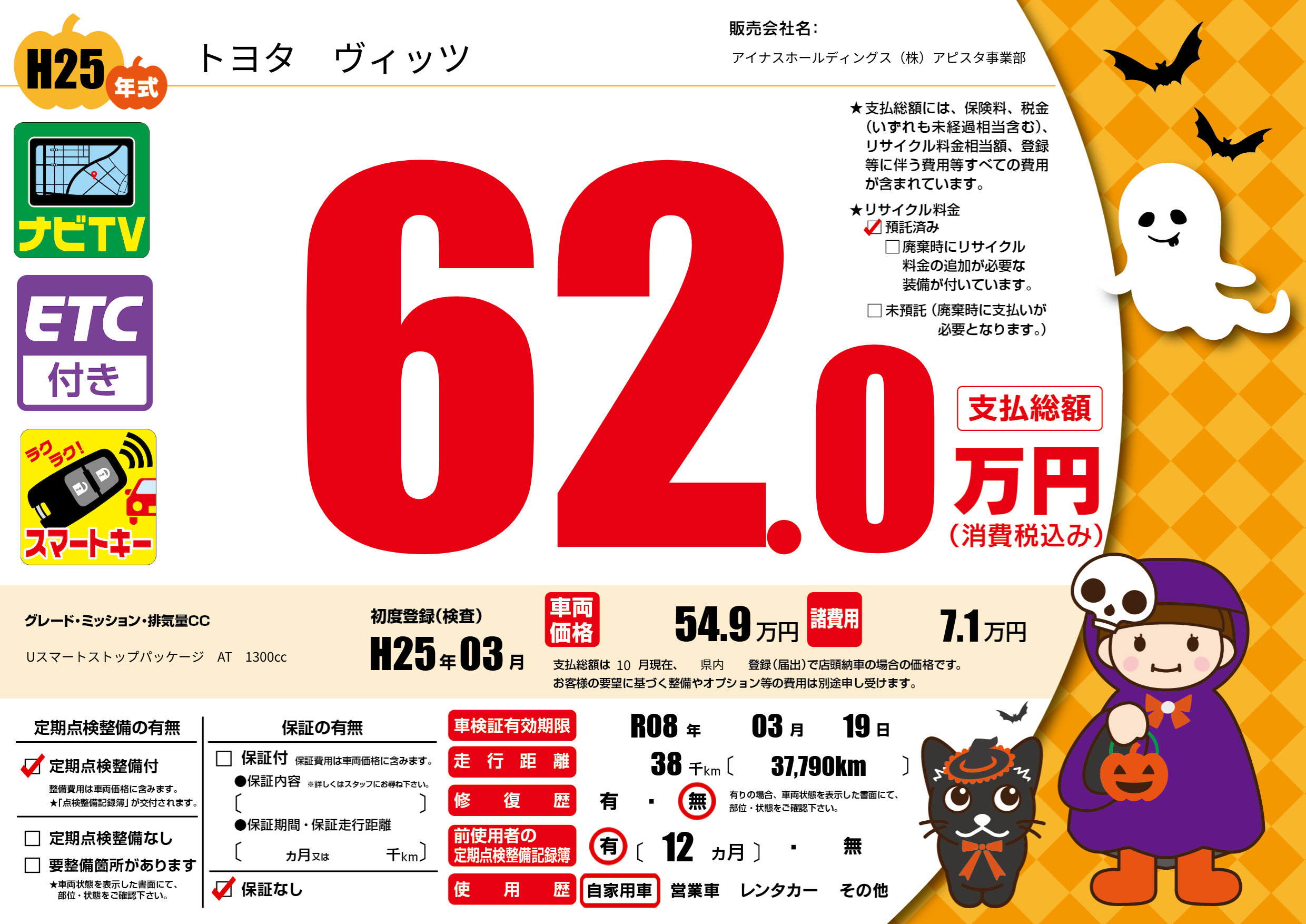 | 走行キロ | 3.8万km | 初年度登録 | H25年03月 |