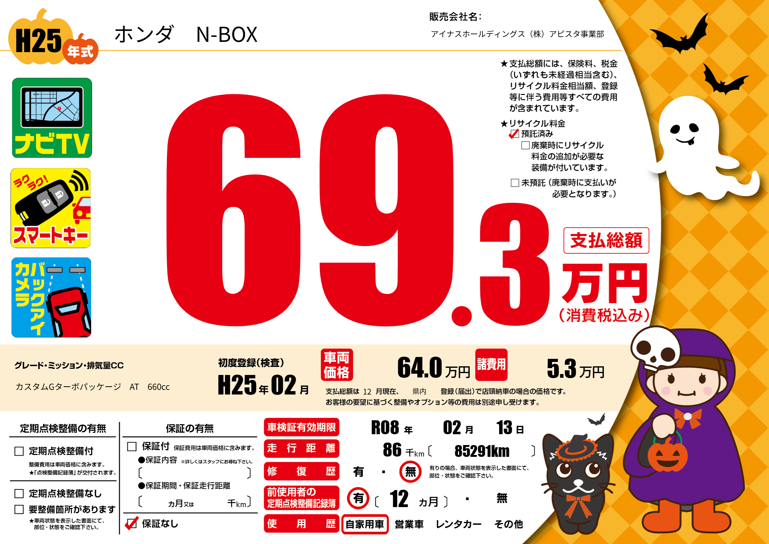 | 車名 | ホンダ N-BOX | グレード ミッション 排気量 |