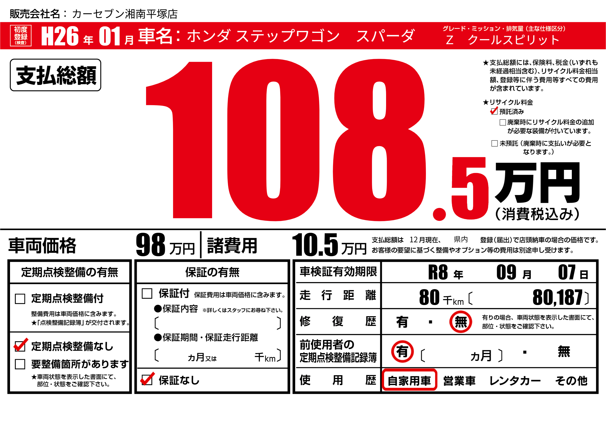 なし | 車検制限 | R8年09月07月 |