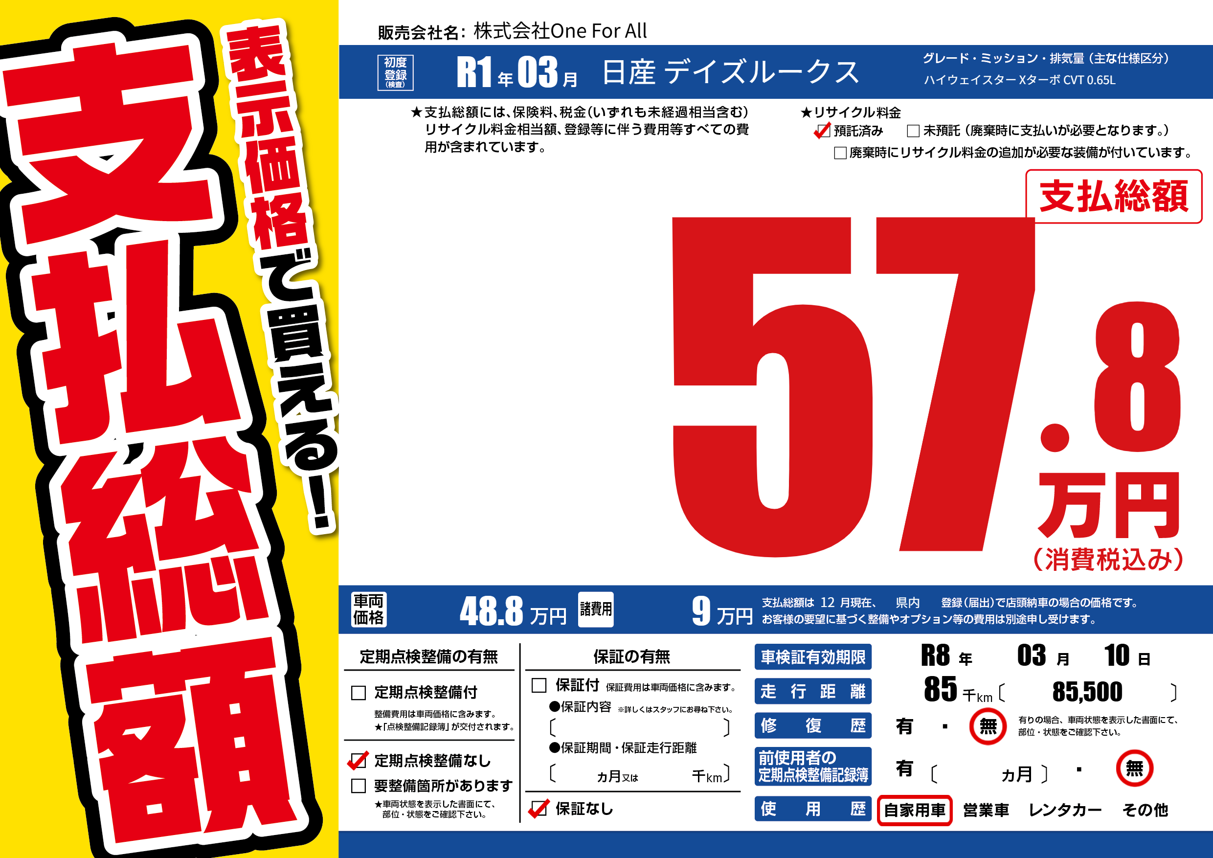 | 車名 | 日産 デイズルークス | グレード ミッション 排気量 |