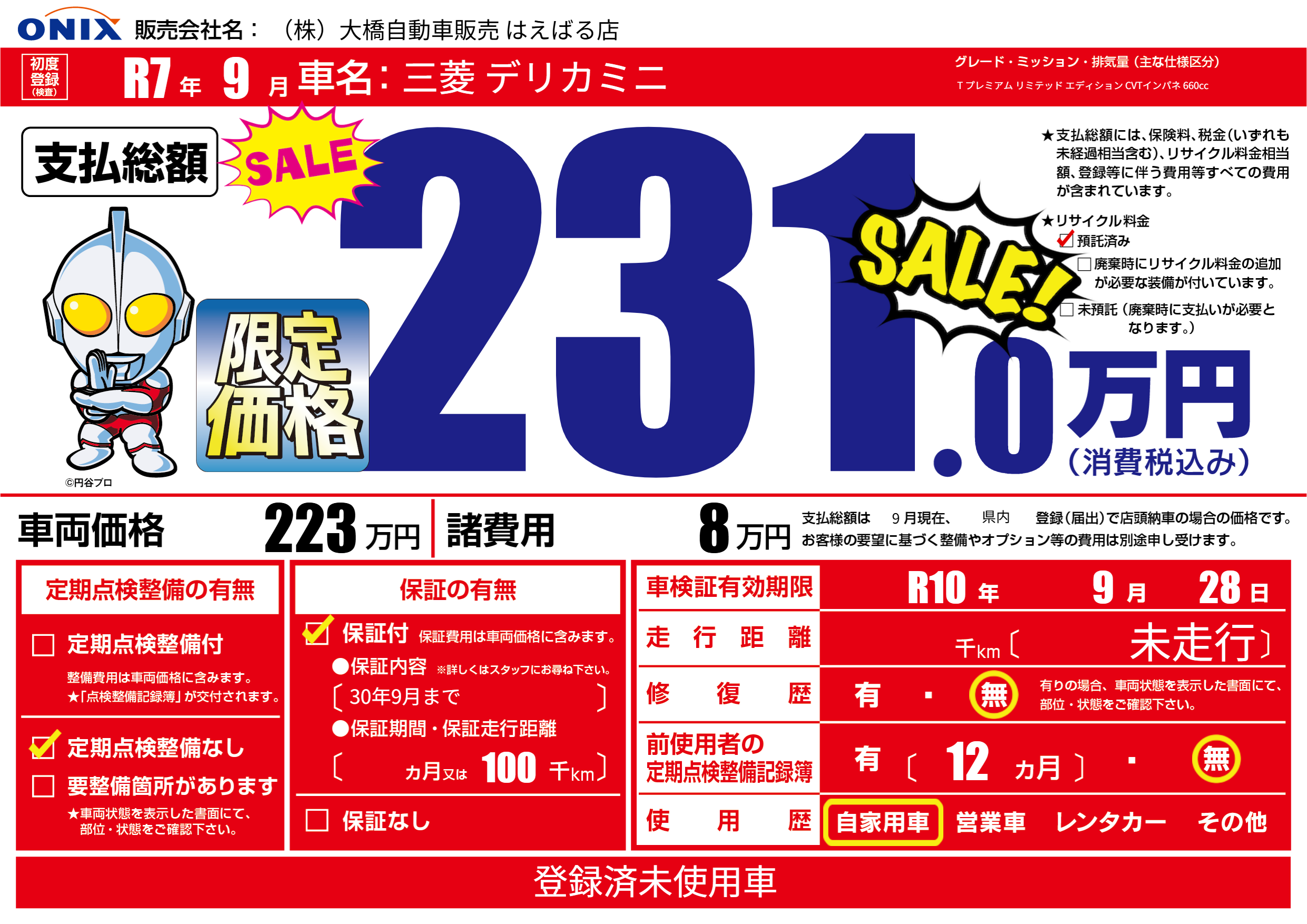 | 走行キロ | - | 初年度登録 | R7年9月 |
