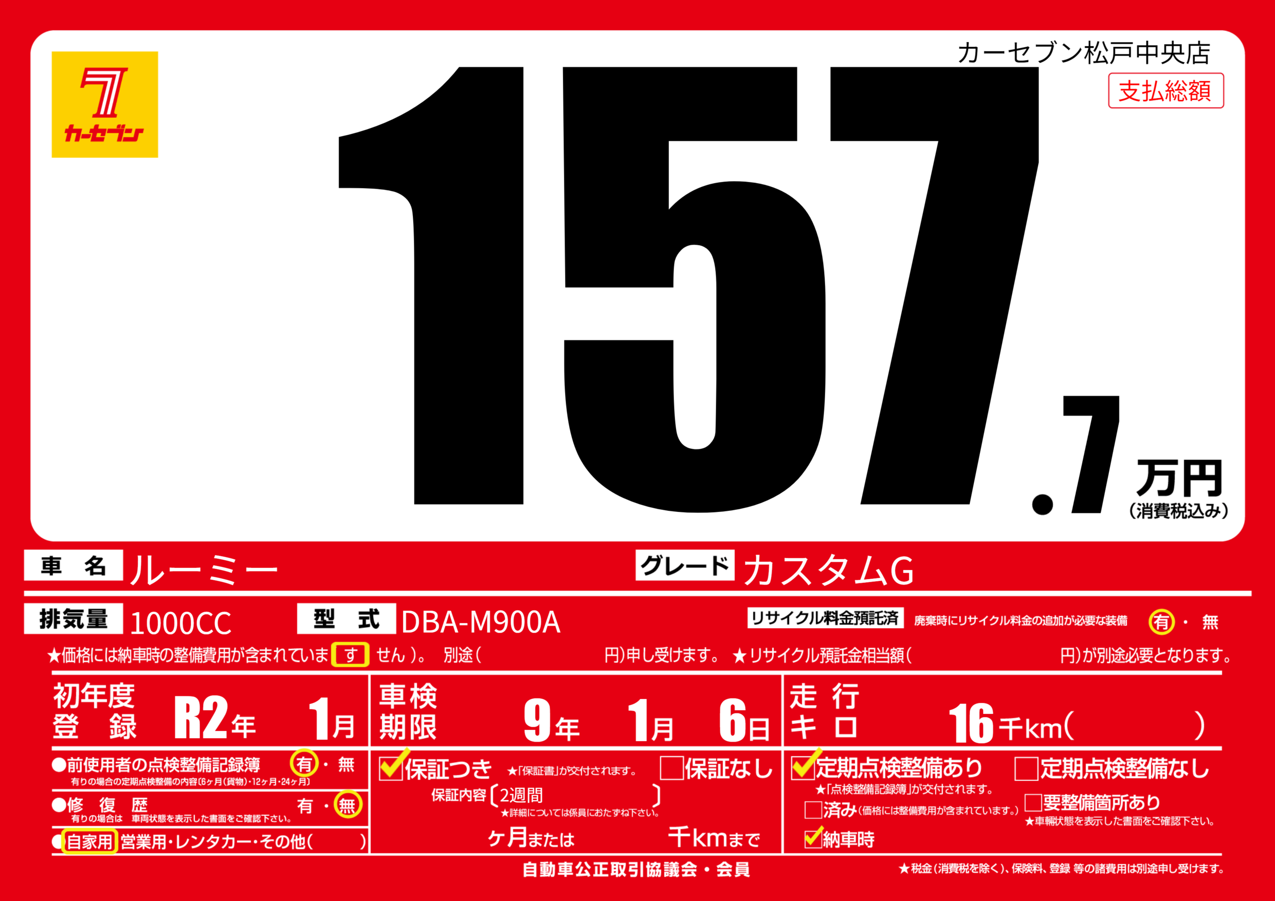 | 車名 | ルーミー | グレード ミッション 排気量 |
