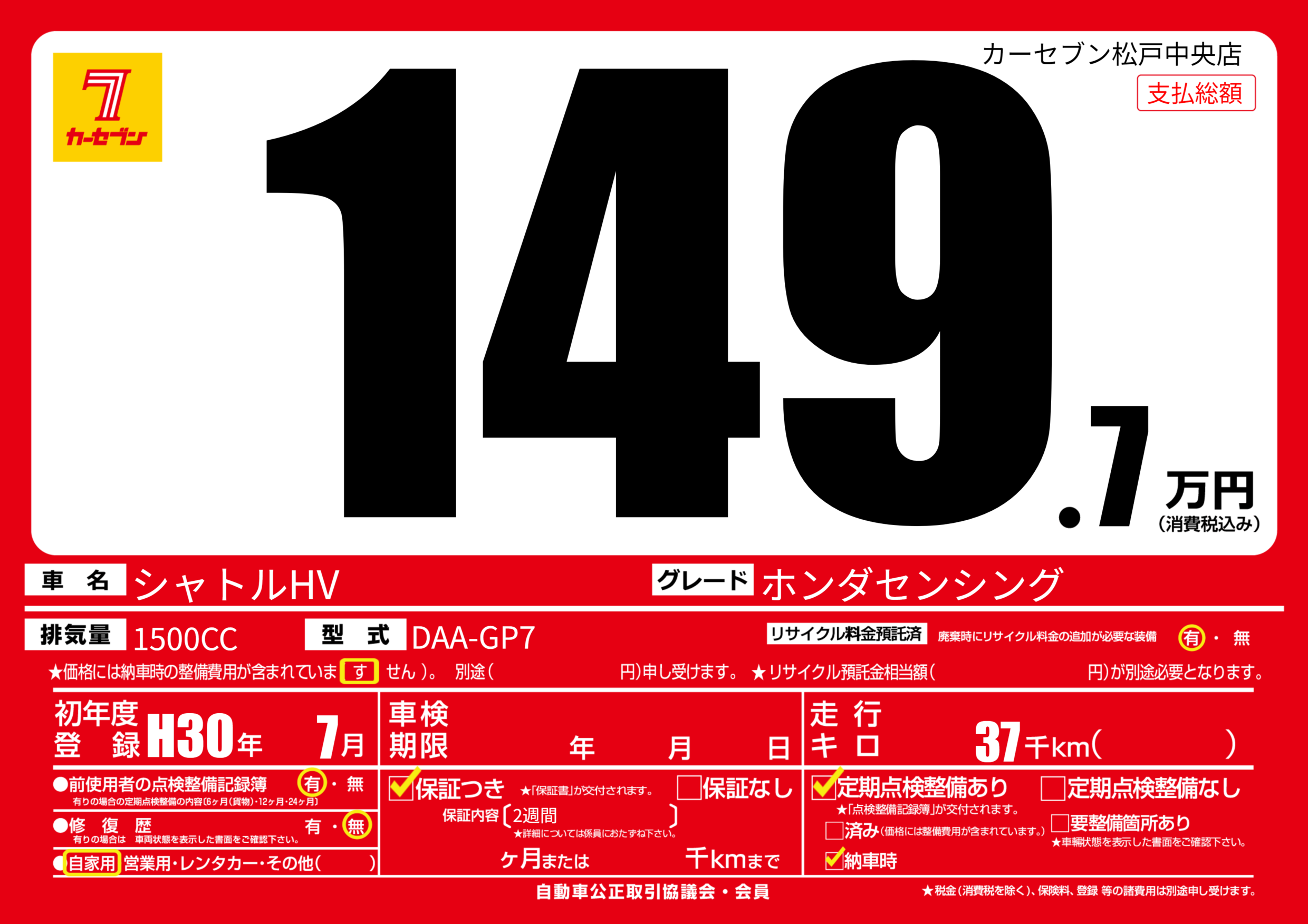| 走行キロ | 3.7万km | 初年度登録 | H30年7月 |