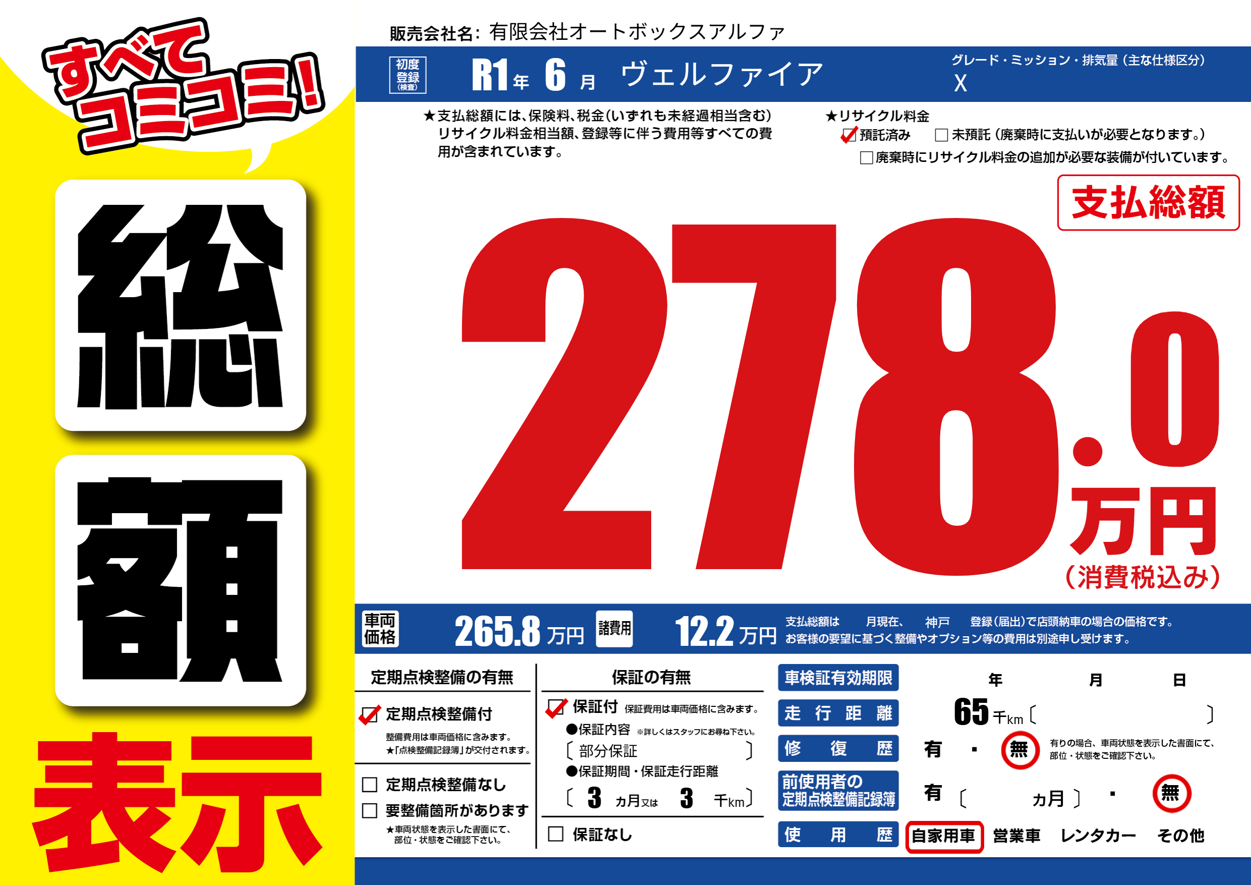 | 車名 | ヴェルファイア | グレード ミッション 排気量 |