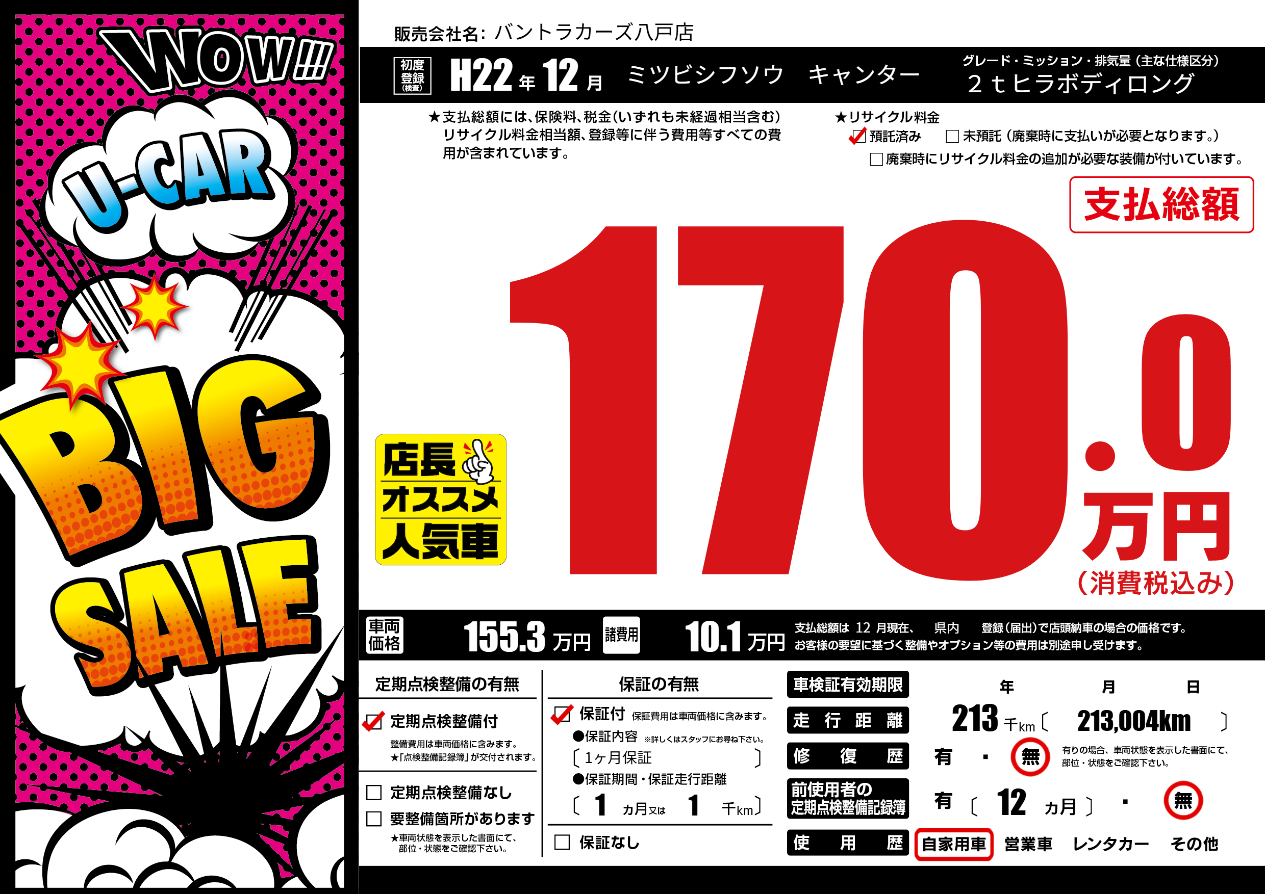 | 走行キロ | 21.3万km | 初年度登録 | H22年12月 |