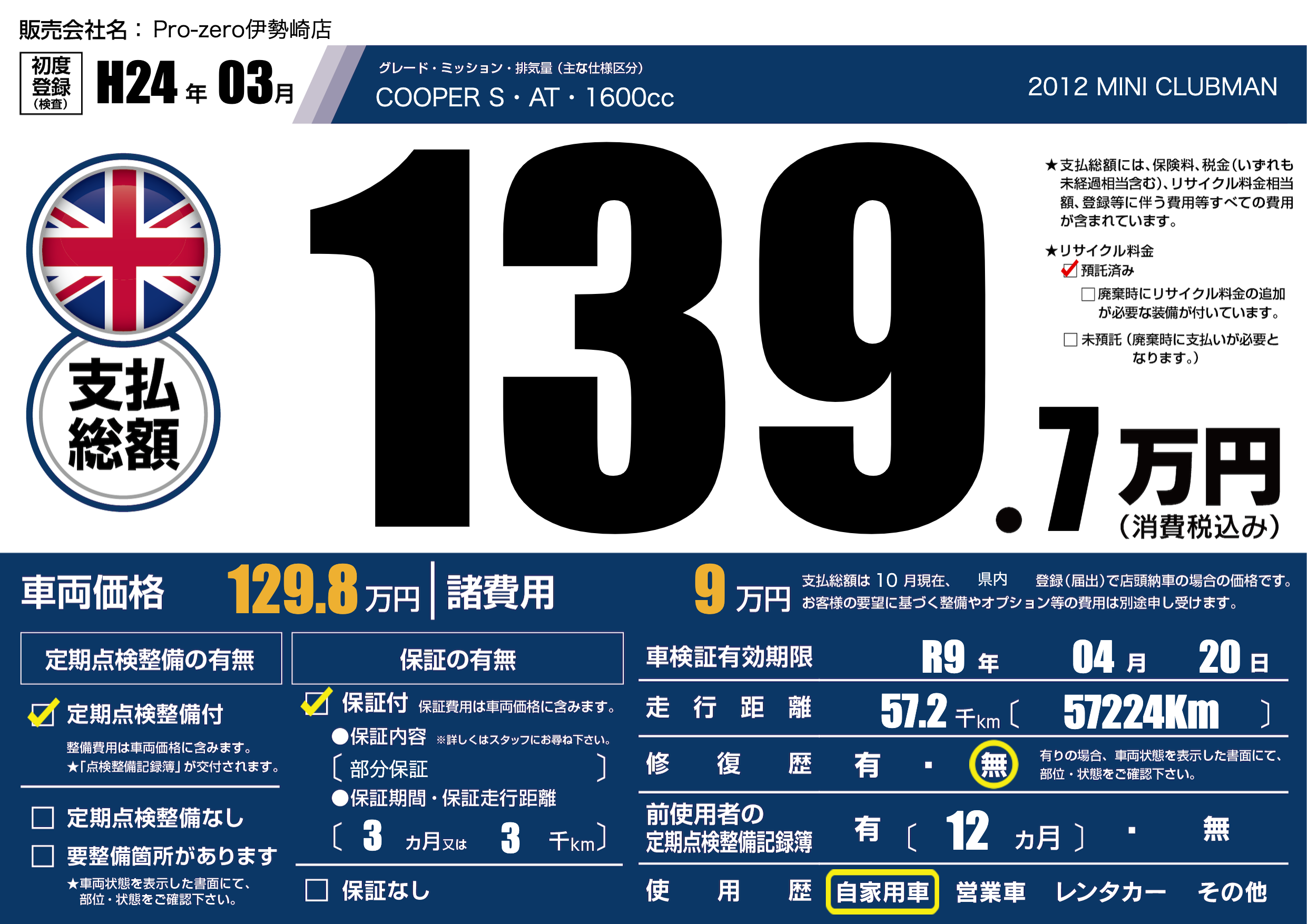 | 車名 | 2012 MINI CLUBMAN | グレード ミッション 排気量 |
