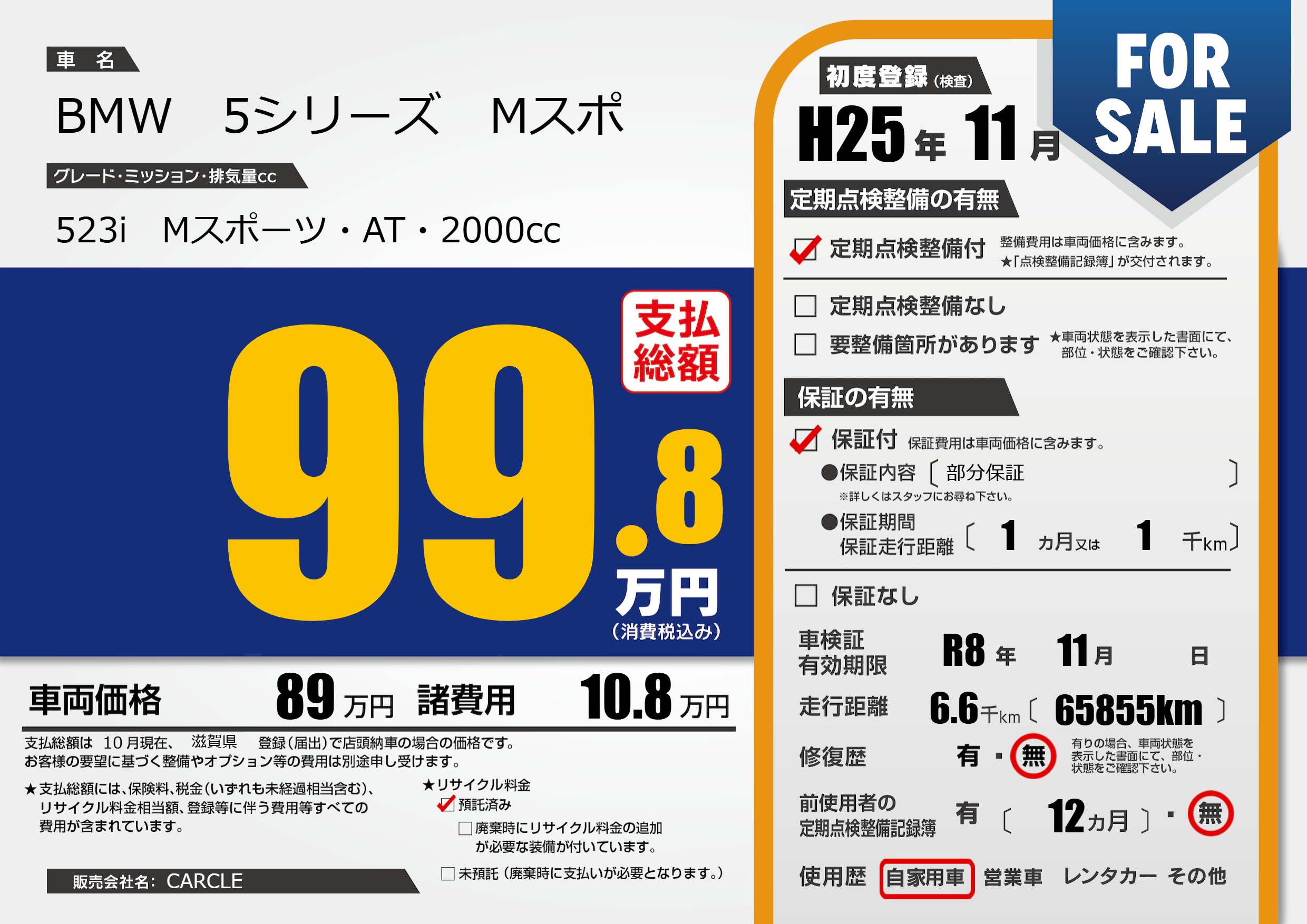 | 車名 | BMW 5シリーズ Mスポ | グレード ミッション 排気量 |