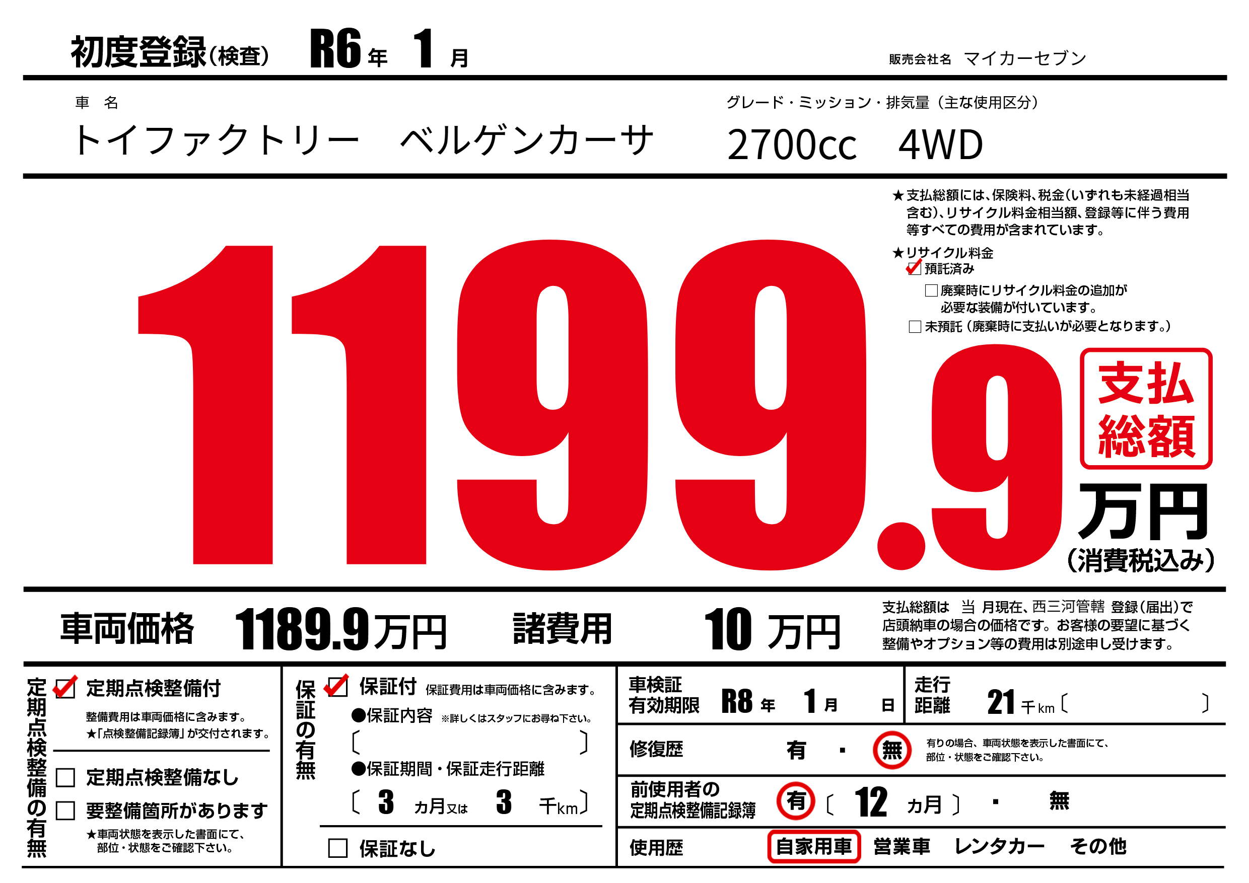 | 走行キロ | 2.1万km | 初年度登録 | R6年1月 |