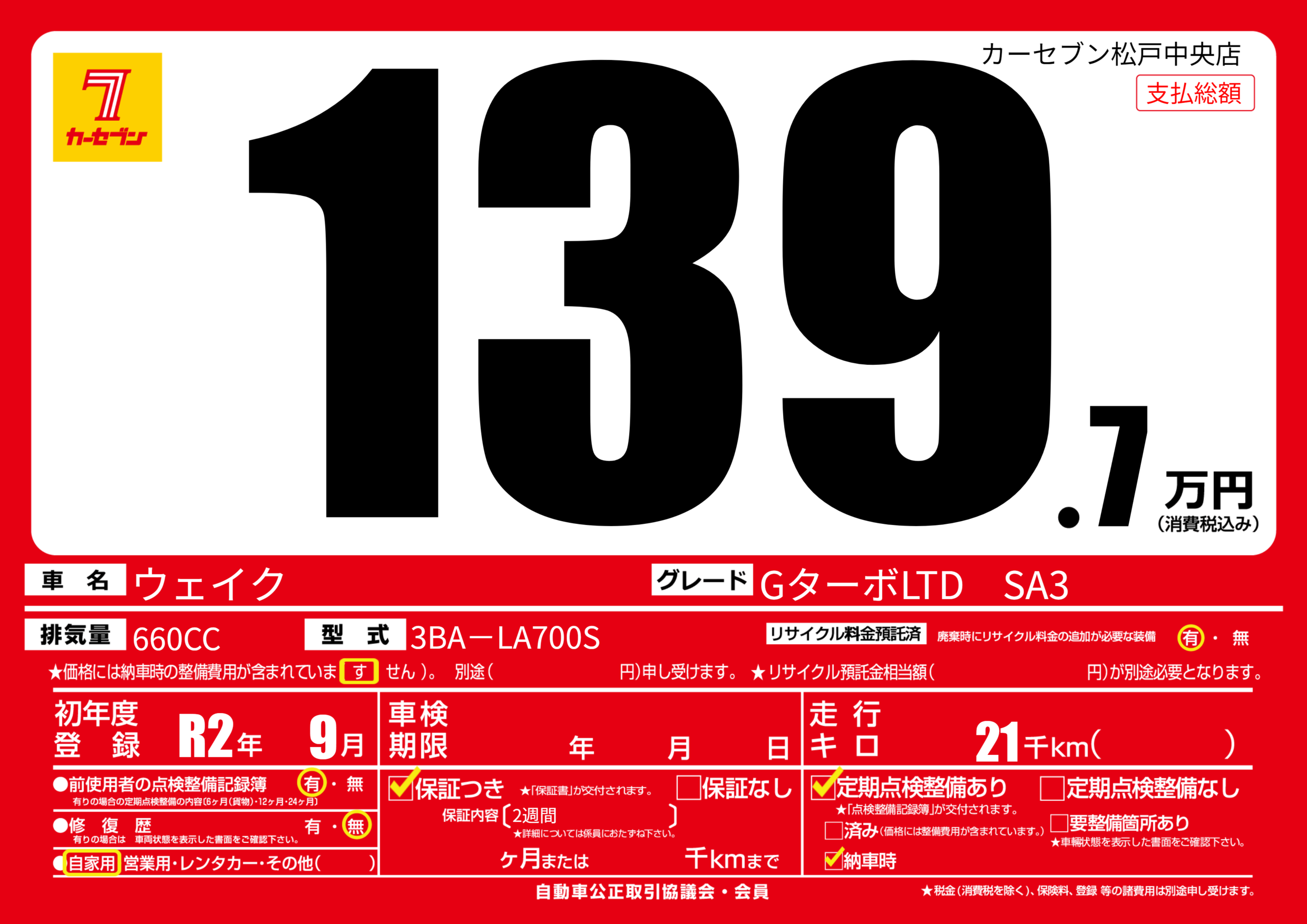 | 車名 | ウェイク | グレード ミッション 排気量 |