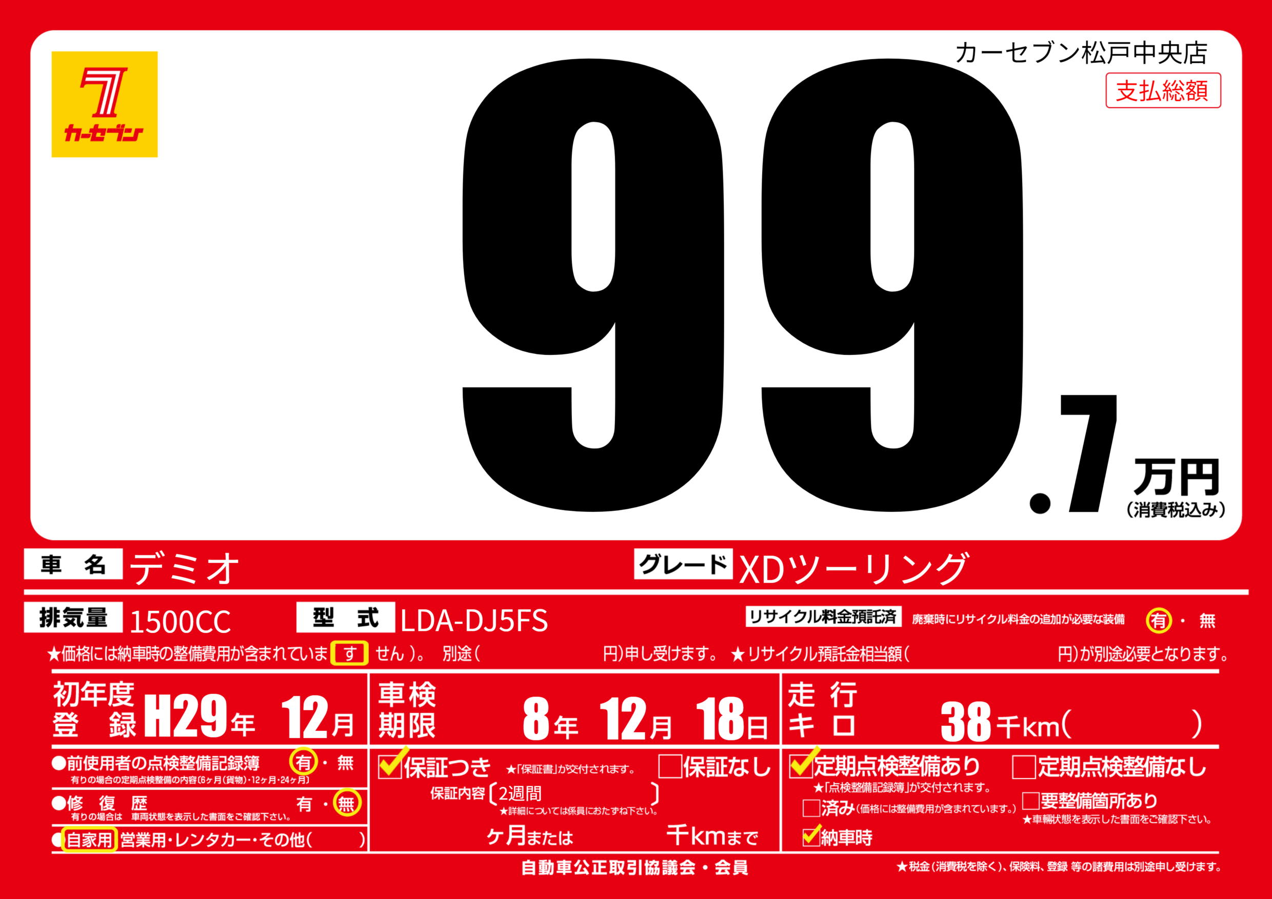 | 車名 | デミオ | グレード ミッション 排気量 |