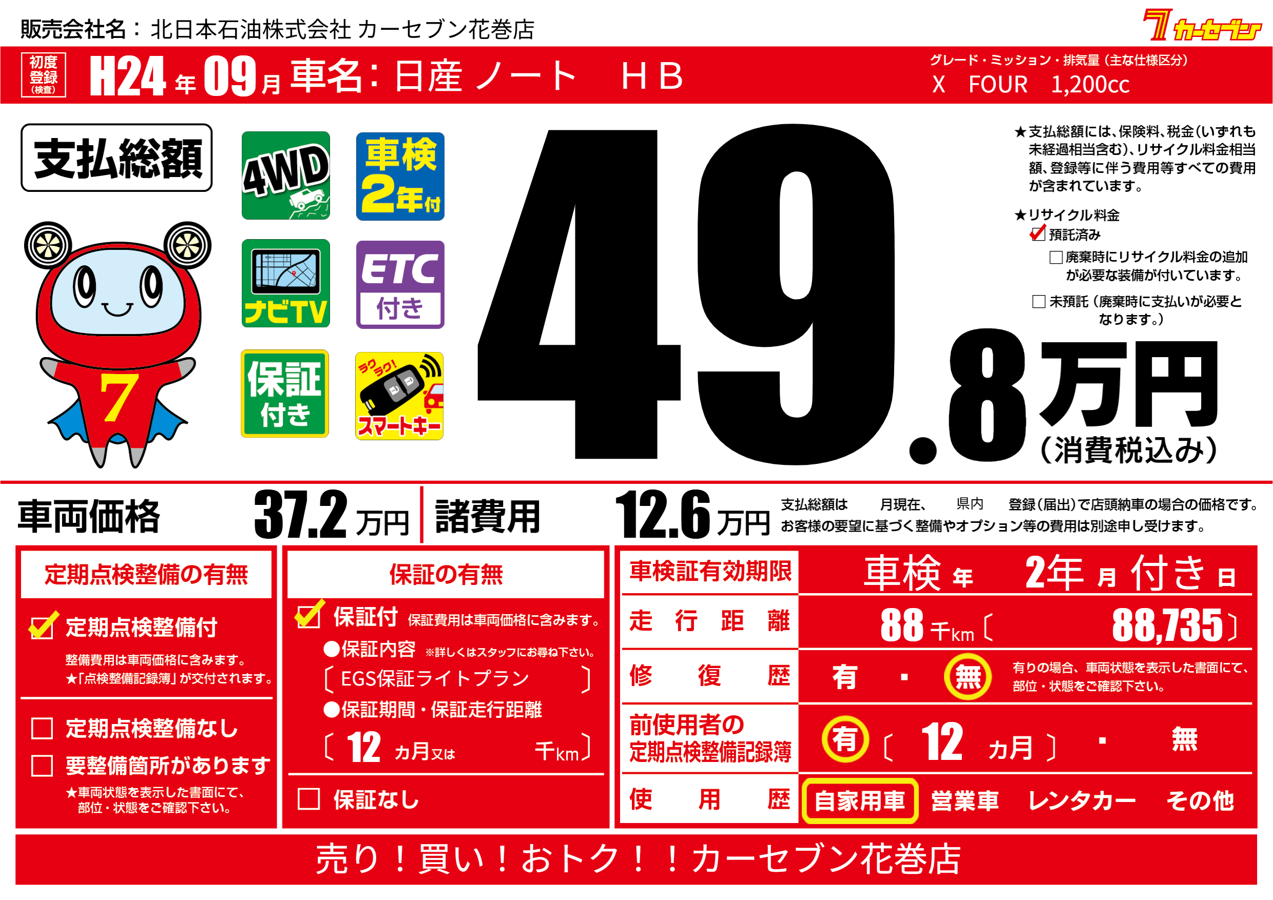 | 走行キロ | 8.8万km | 初年度登録 | H24年09月 |