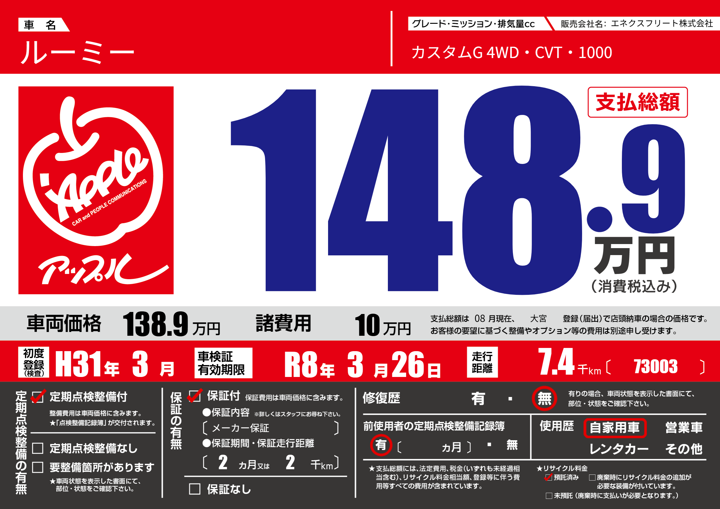 | 車名 | ルーミー | グレード ミッション 排気量 |
