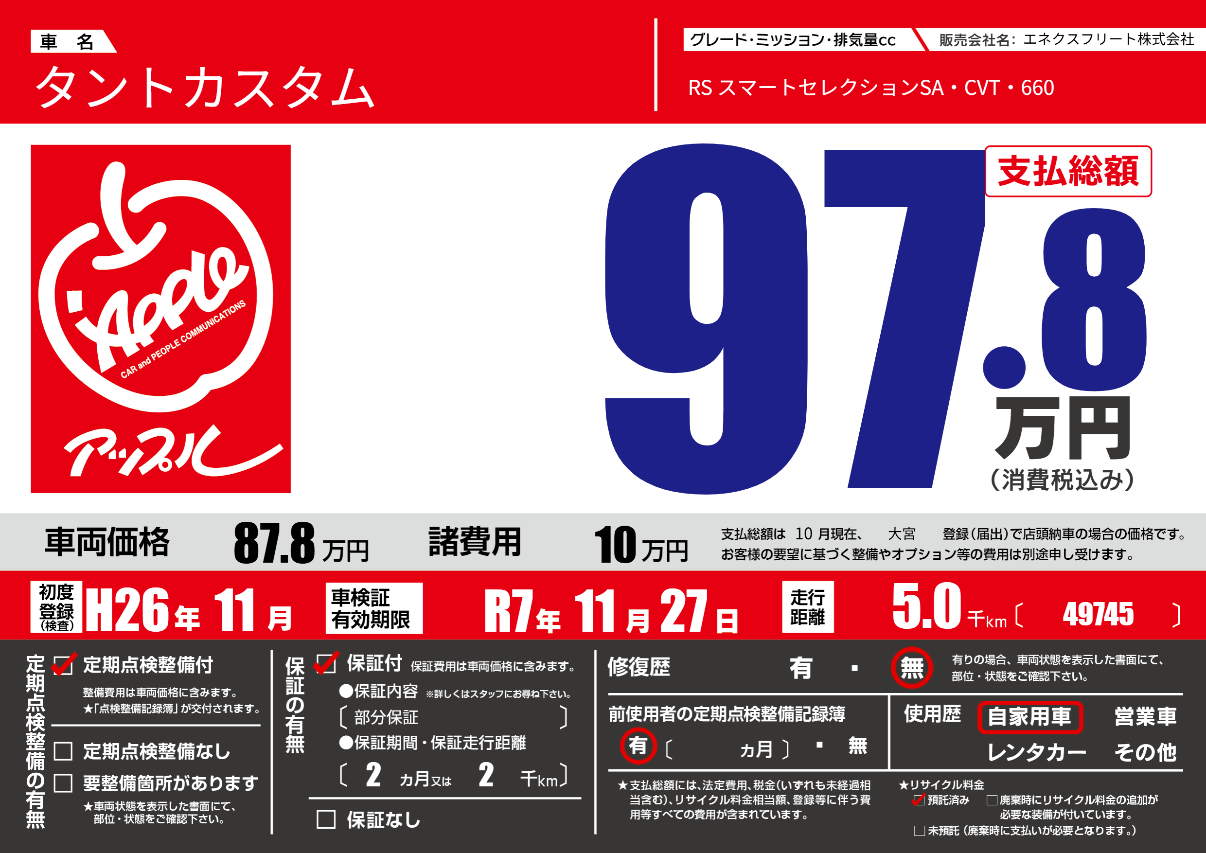 | 走行キロ | 0.5万km | 初年度登録 | H26年11月 |