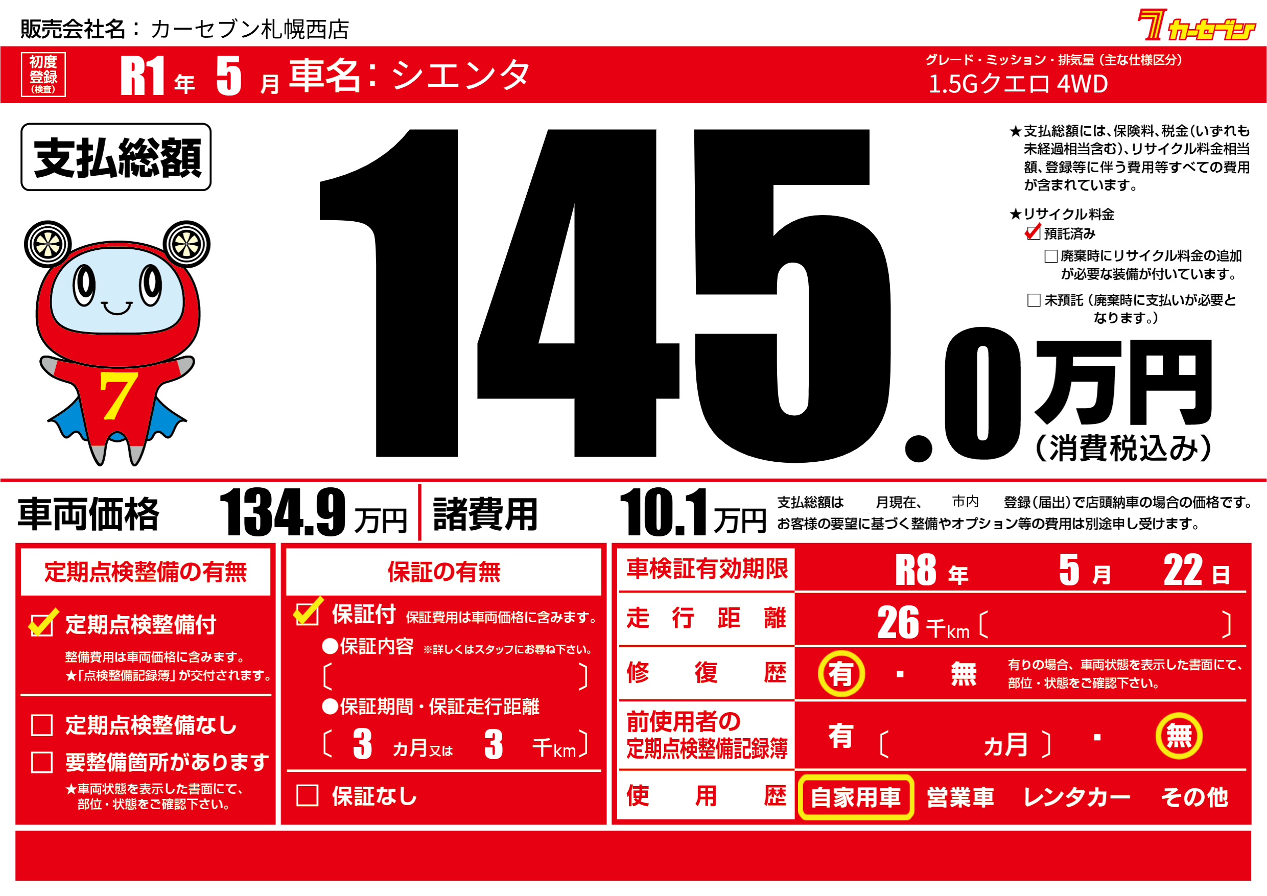 | 車名 | シエンタ | グレード ミッション 排気量 |
