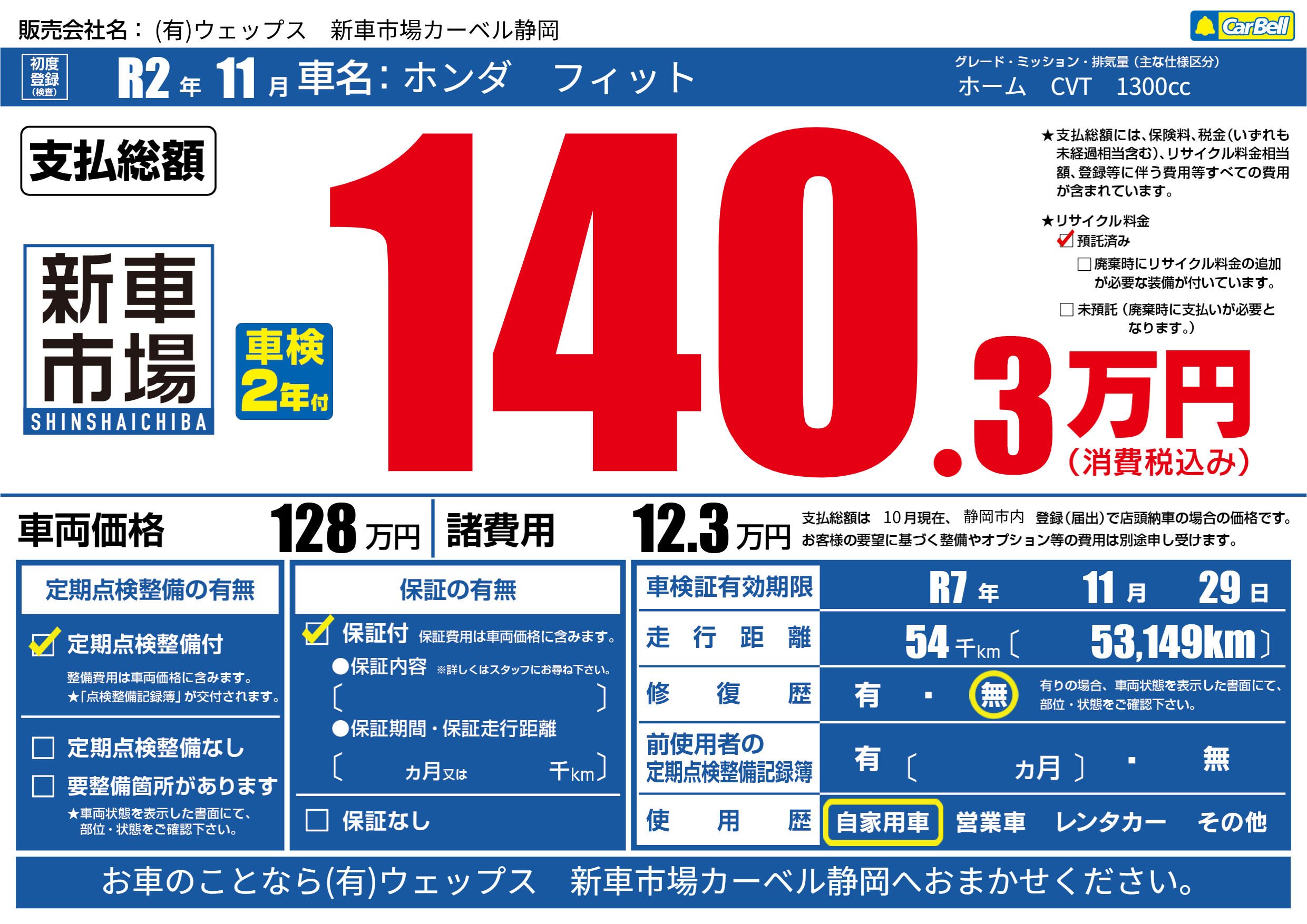 | 車名 | ホンダ フィット | グレード ミッション 排気量 |