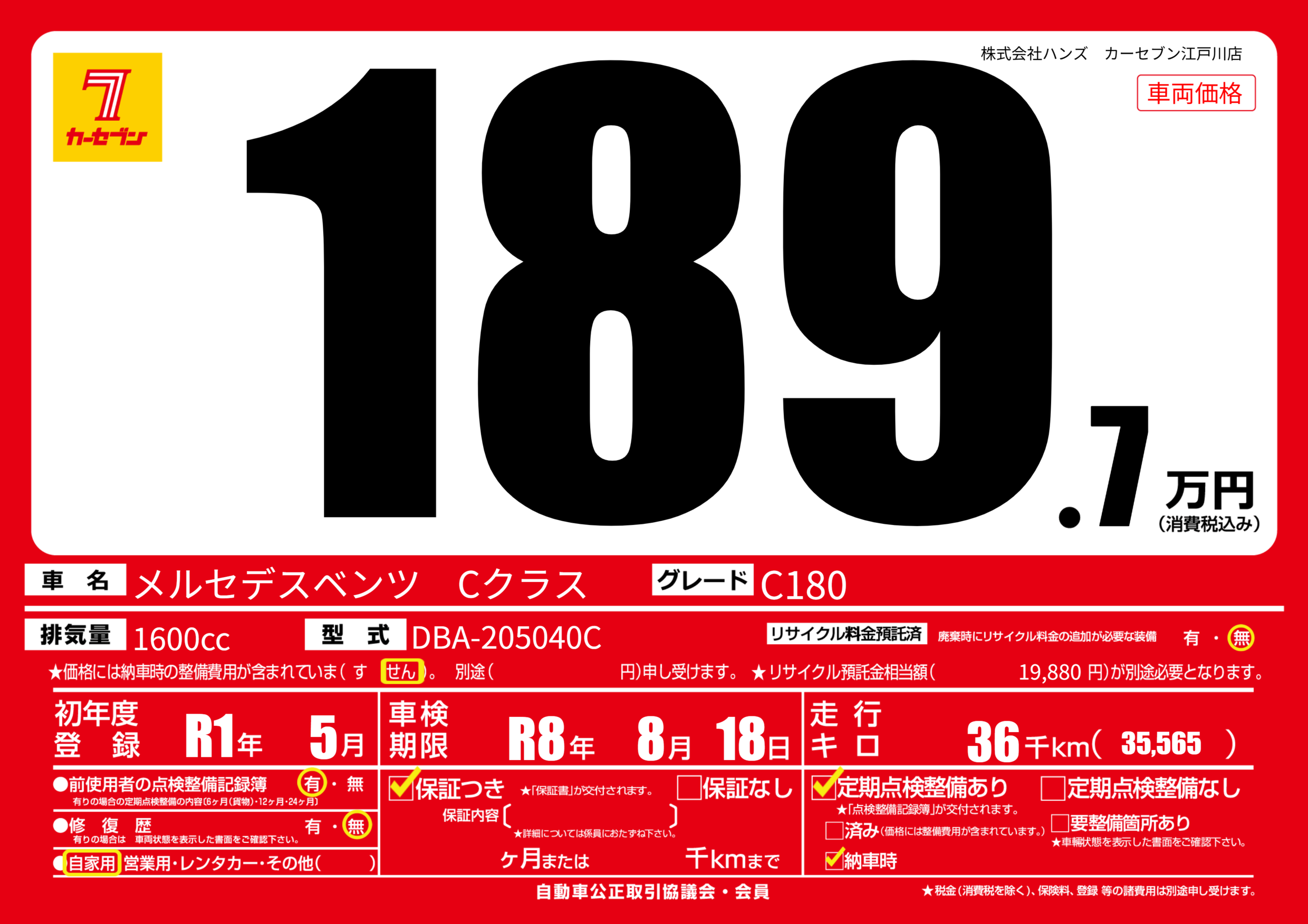 | 車名 | メルセデスベンツ Cクラス | グレード ミッション 排気量 |