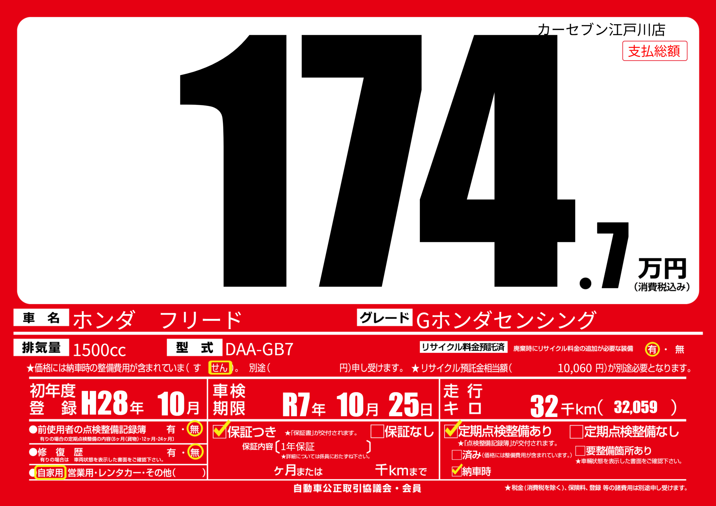 | 車名 | ホンダ フリード | グレード ミッション 排気量 |