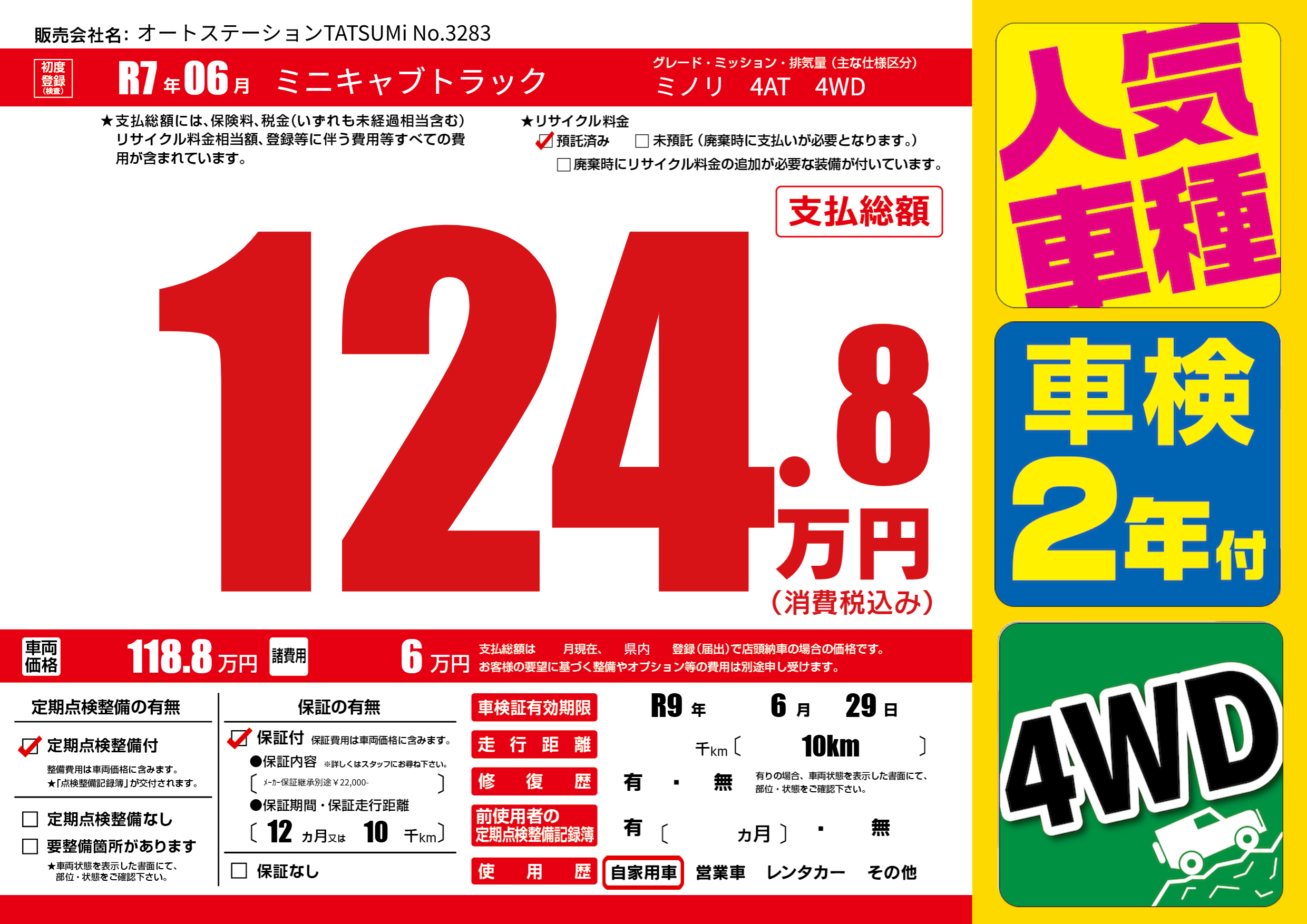 | 走行キロ | - | 初年度登録 | R7年06月 |