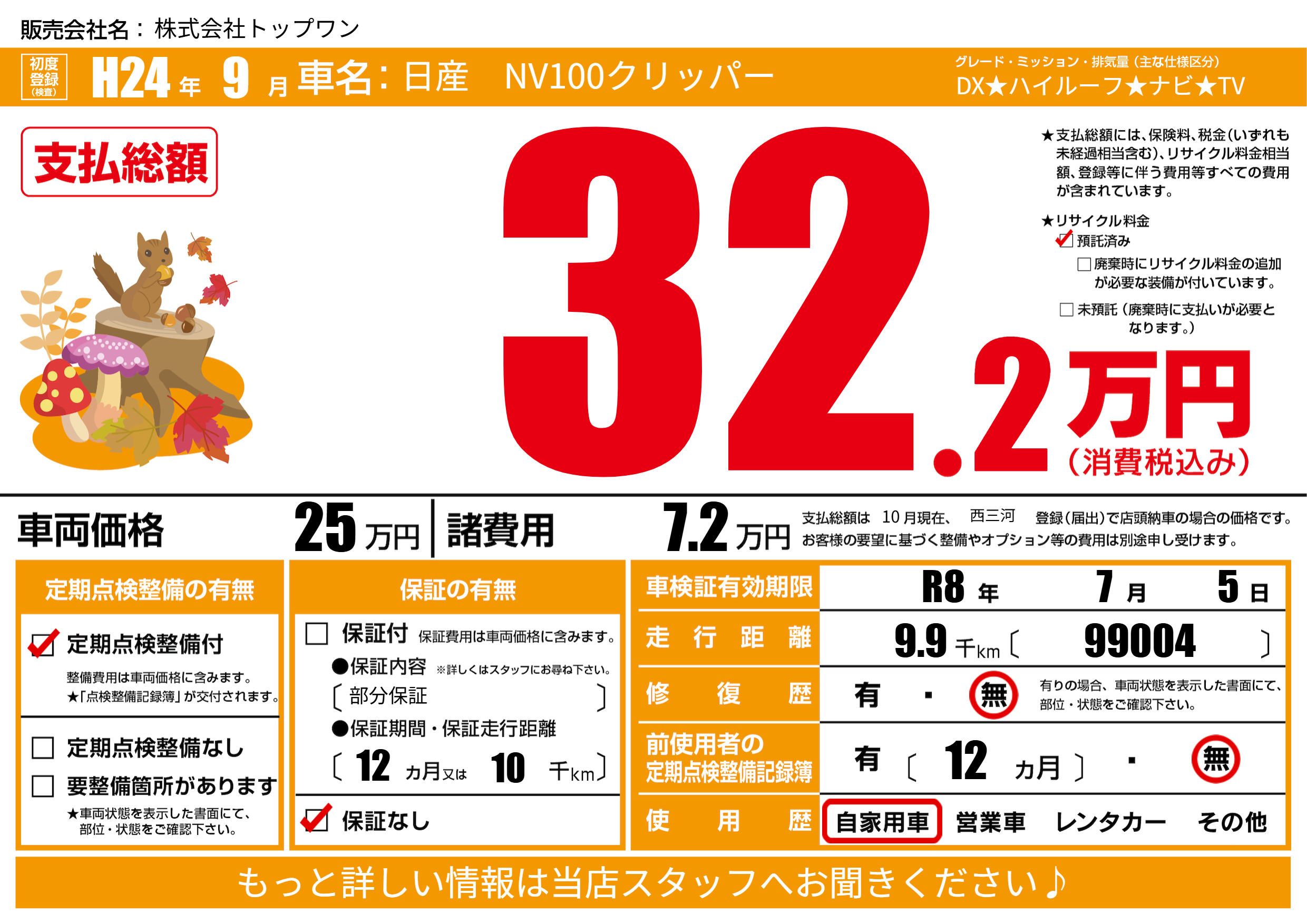| 走行キロ | 0.9万km | 初年度登録 | H24年9月 |