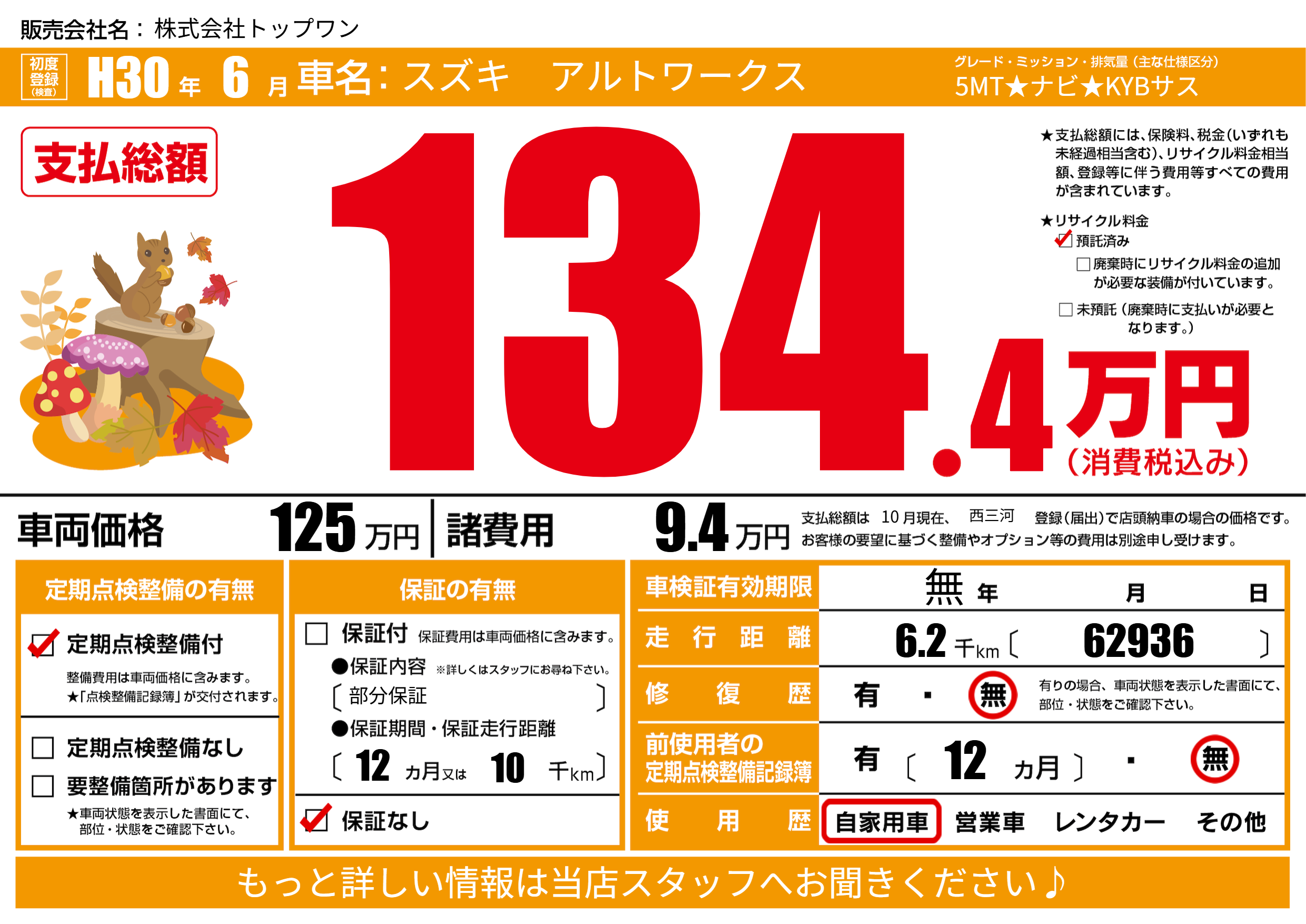 | 車名 | スズキ アルトワークス | グレード ミッション 排気量 |