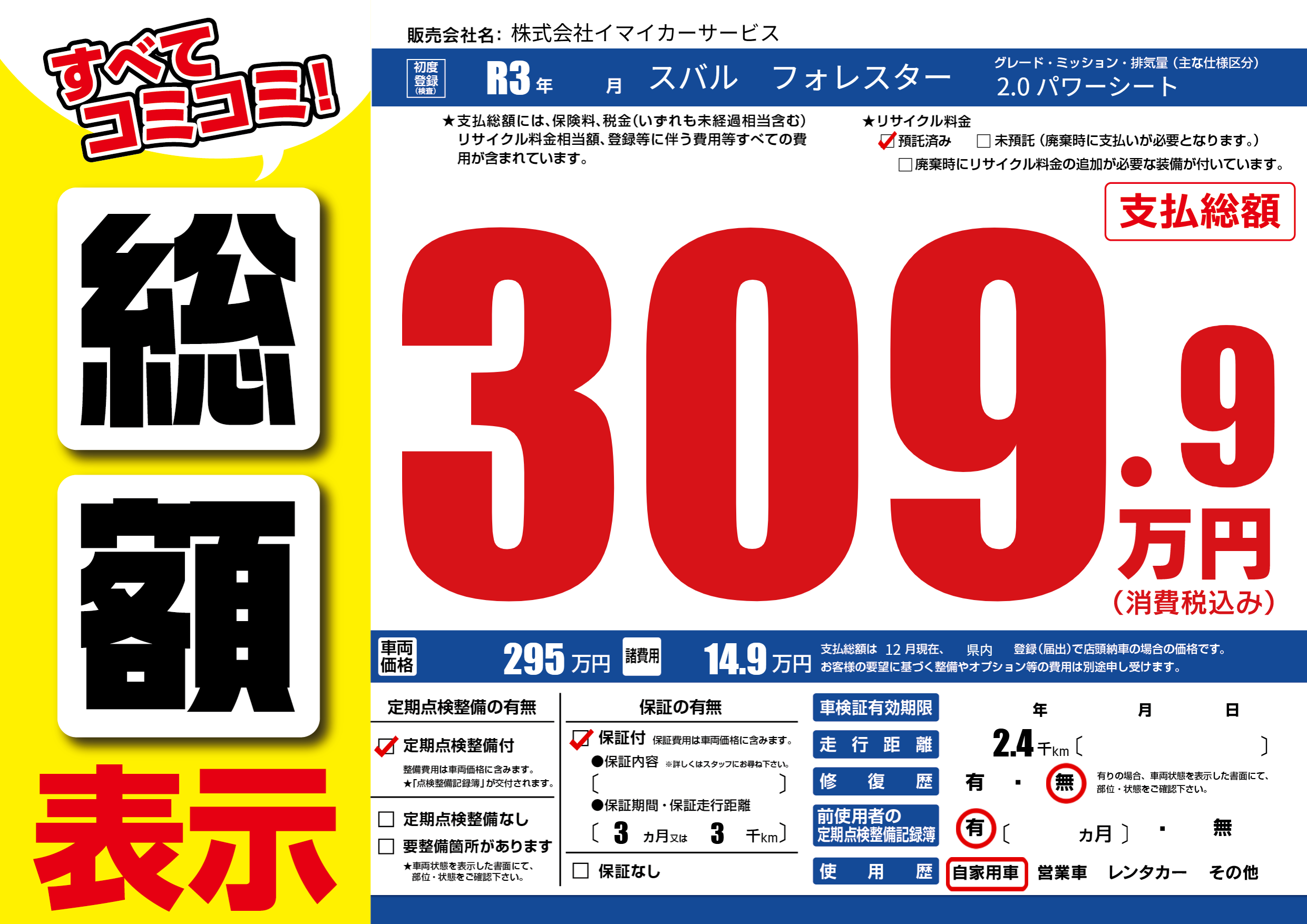 | 車名 | スバル フォレスター | グレード ミッション 排気量 |