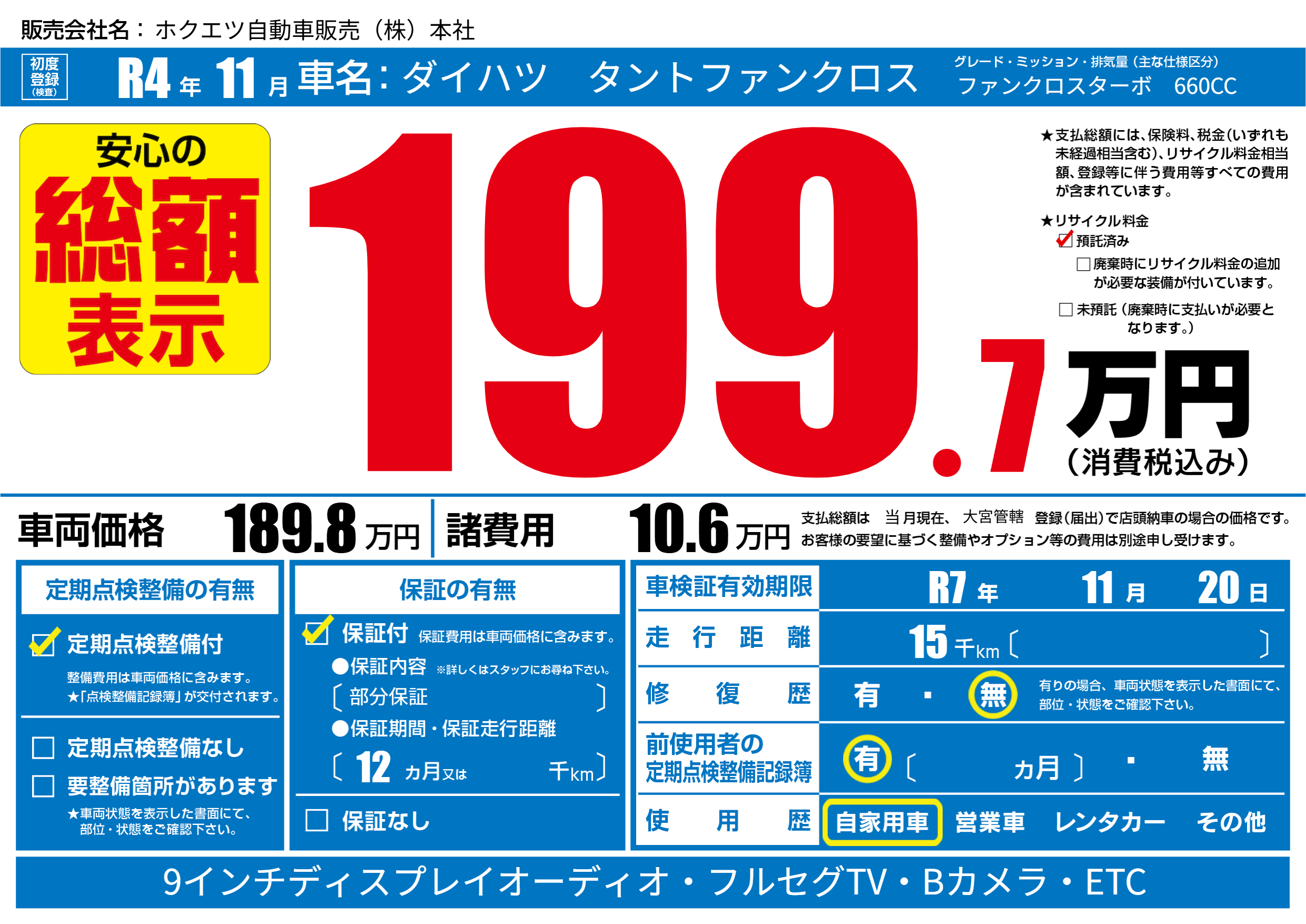 | 車検制限 | R7年 11月 20日 | ||