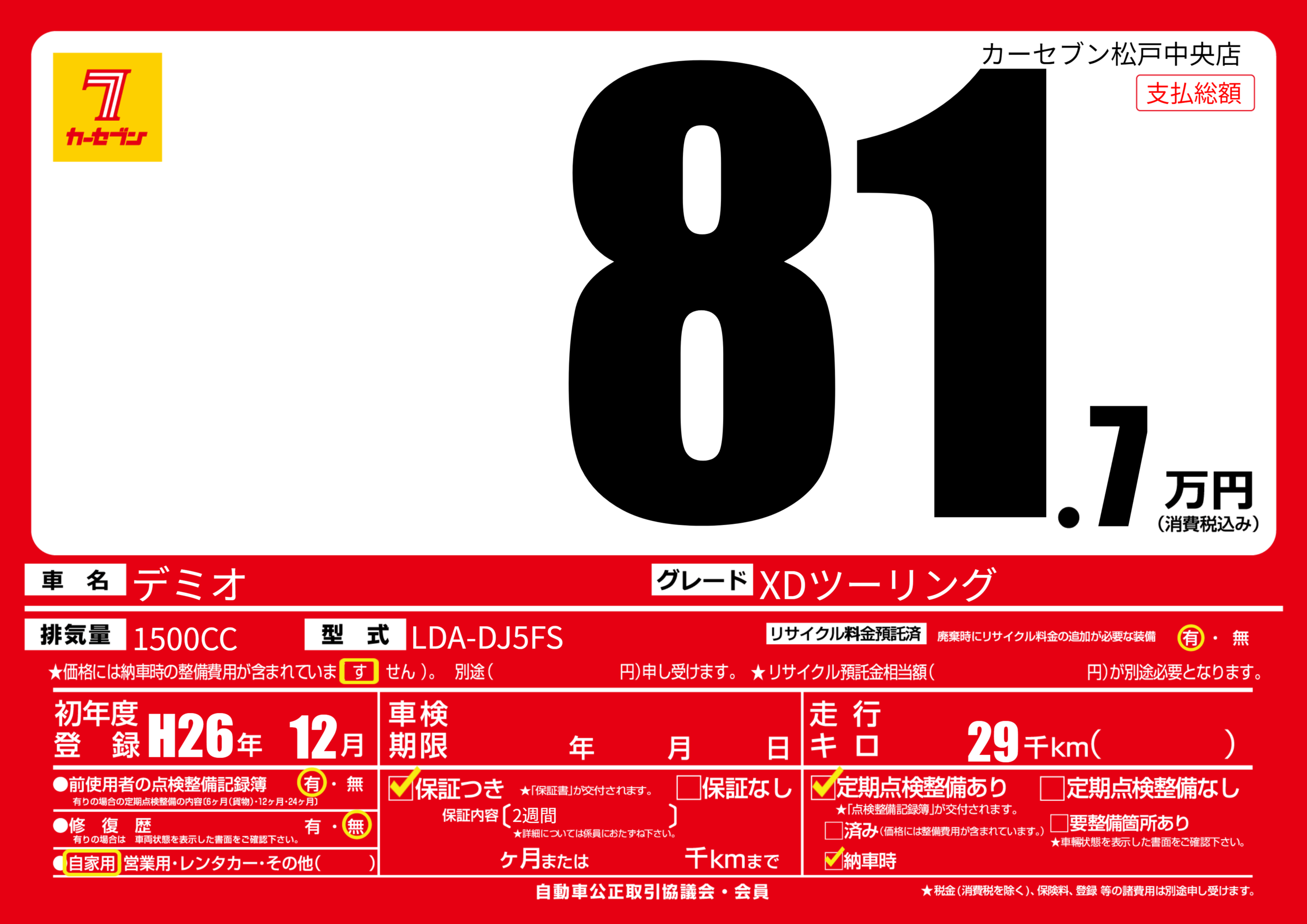 | 車名 | デミオ | グレード ミッション 排気量 |