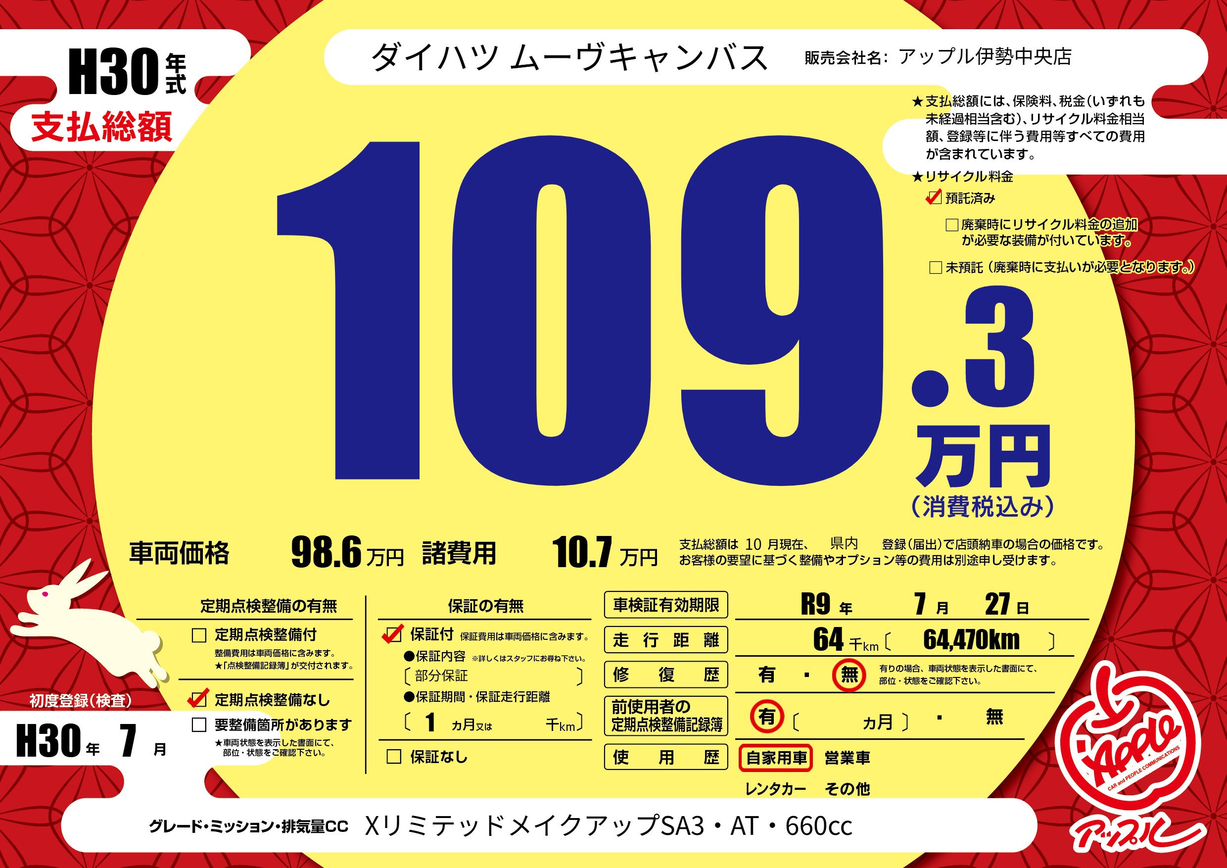 | 初年度登録 | H30年7月 | ||