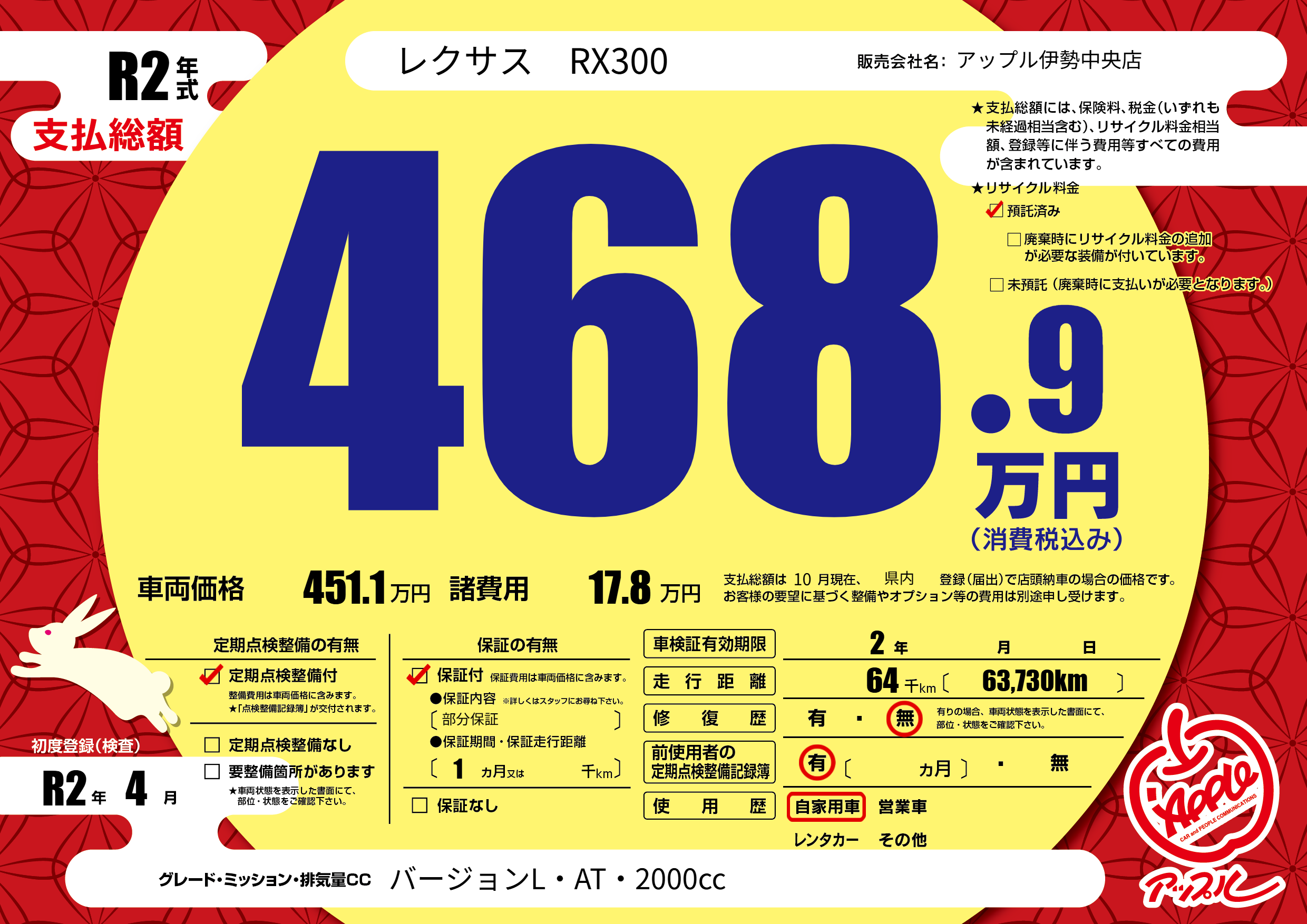 | 車名 | レクサス RX300 | グレード ミッション 排気量 |