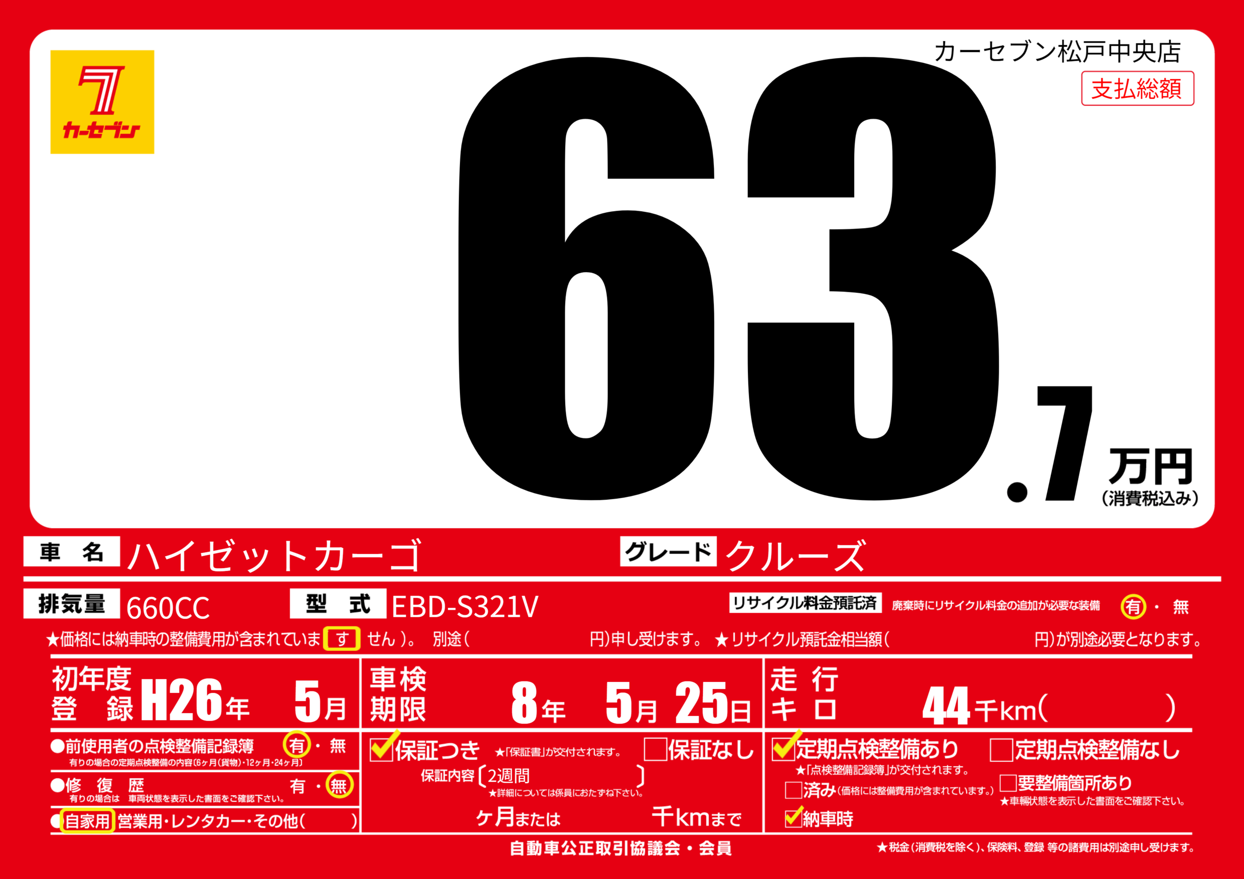 | 車名 | ハイゼットカーゴ | グレード ミッション 排気量 |